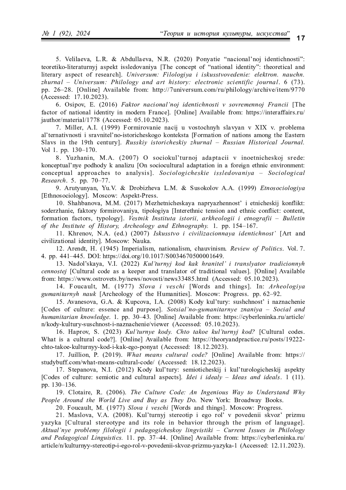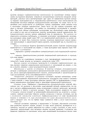 Статья: ФЕНОМЕНОЛОГИЧЕСКИЕ АСПЕКТЫ ПОНЯТИЙ "НАЦИОНАЛЬНАЯ КУЛЬТУРНАЯ ИДЕНТИЧНОСТЬ" И "КУЛЬТУРНЫЙ КОД НАЦИИ" (2024)
