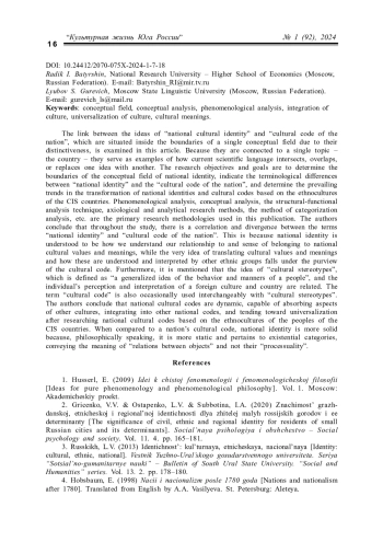 БАТЫРШИН Р. И., ГУРЕВИЧ Л. С. ФЕНОМЕНОЛОГИЧЕСКИЕ АСПЕКТЫ ПОНЯТИЙ "НАЦИОНАЛЬНАЯ КУЛЬТУРНАЯ ИДЕНТИЧНОСТЬ" И "КУЛЬТУРНЫЙ КОД НАЦИИ" // КУЛЬТУРНАЯ ЖИЗНЬ ЮГА РОССИИ. 2024. № 1 (92)