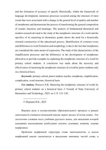 В данной статье в рамках филологической и педагогической проблематики исследуются теоретические основы освоения морфемной структуры слова младшими школьниками с учетом исторических аспектов её формирования. Морфемам свойственно семантико-словообразовательное и грамматическое значение, поэтому освоение морфемной структуры слова на исторической основе способствует лучшему пониманию значений слова, его стилистической и экспрессивной окрашенности, осознанию роли морфем в слове, формированию точности речи. Исторически в рамках развития языка среди структуры большей части слов происходили многочисленные процессы, которые имели связь с изменением общего уровня качества и числа морфем и демонстрируют процесс преобразования общего состава звуков, функций и значений. Анализ фундаментальных теоретических и современных исследований, посвященных изучению морфемной структуры слова и специфике её освоения в начальных классах, показывает необходимость исторически ориентированного построения образовательного процесса. Выявление общих черт и различий в словообразовании и морфологии связано с тем, что основным средством выражения считаются морфемы. Изучение характеристики процессов опрощения и различия в разработке морфем позволило привести примеры в объяснении морфемной структуры слова для учеников начальной школы. Сделан вывод о необходимости и эффективности освоения младшими школьниками морфемной структуры слова только на исторической основе.