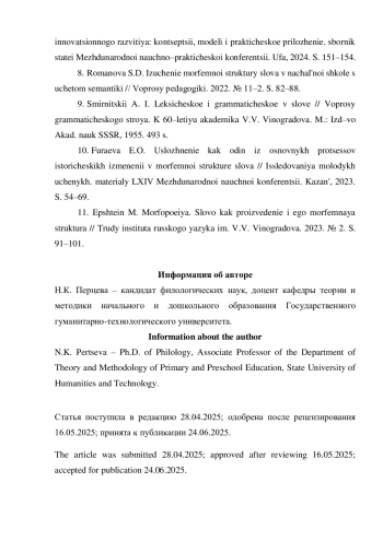 8. Романова С.Д. Изучение морфемной структуры слова в начальной школе с учётом семантики // Вопросы педагогики. 2022. № 11-2. С. 82-88. EDN: BRGVYA