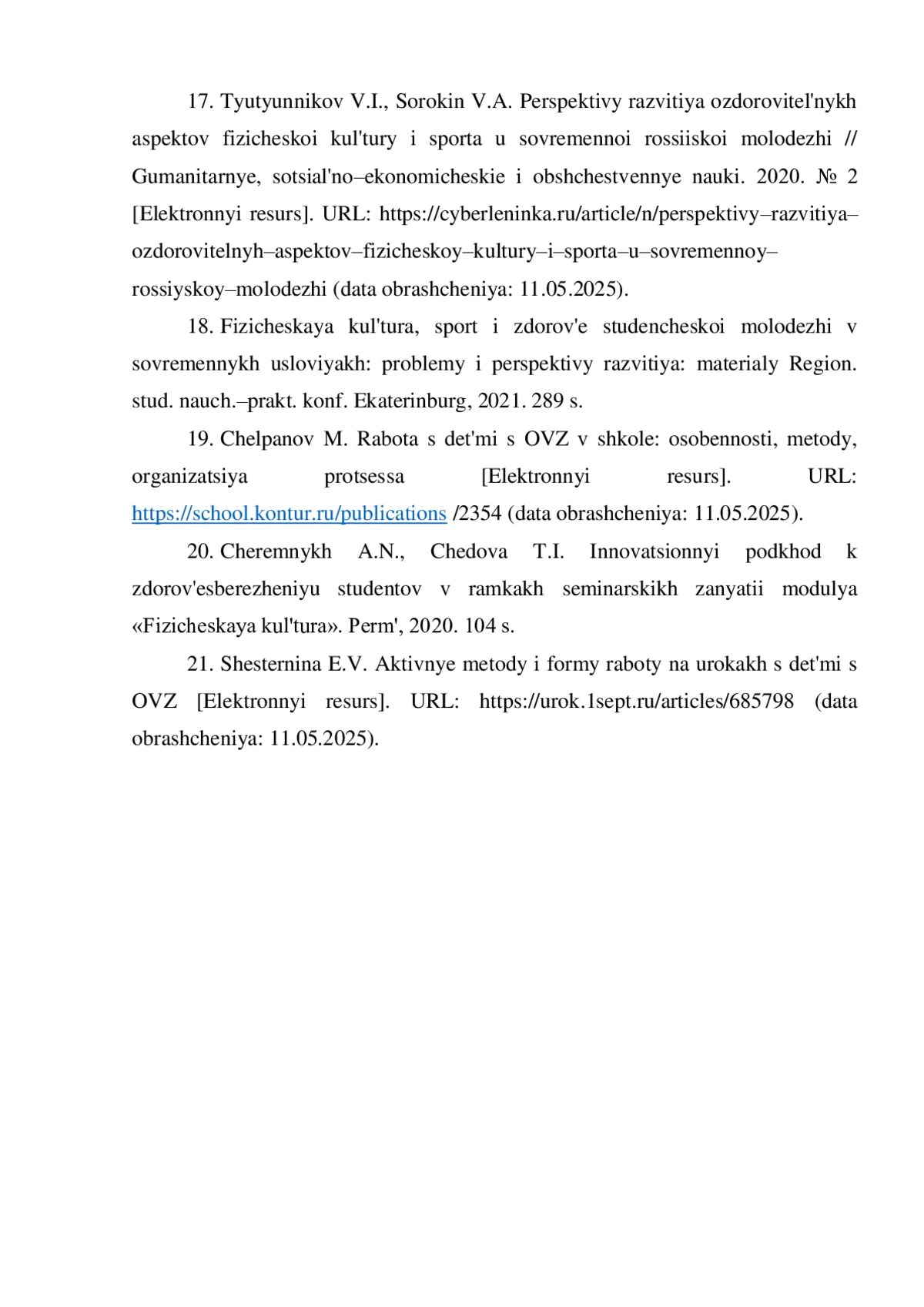 17. Тютюнников В.И., Сорокин В.А. Перспективы развития оздоровительных аспектов физической культуры и спорта у современной российской молодежи / Гуманитарные, социально-экономические и общественные науки. 2020. № 2 [Электронный ресурс]. URL: https://cyberleninka.ru/article/n/perspektivy-razvitiya-ozdorovitelnyh-aspektov-fizicheskoy-kultury-i-sporta-u-sovremennoy-rossiyskoy-molodezhi (дата обращения: 11.05.2025). EDN: YDRYGR