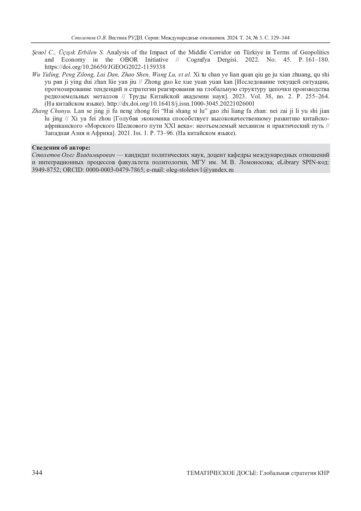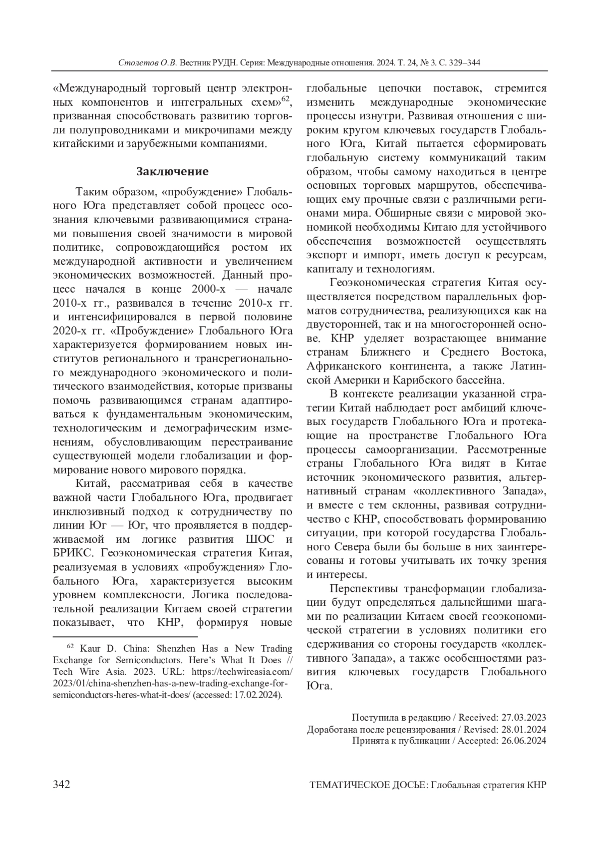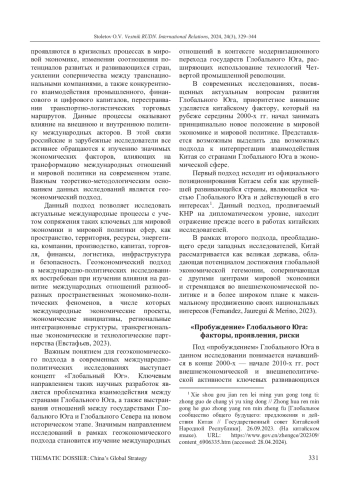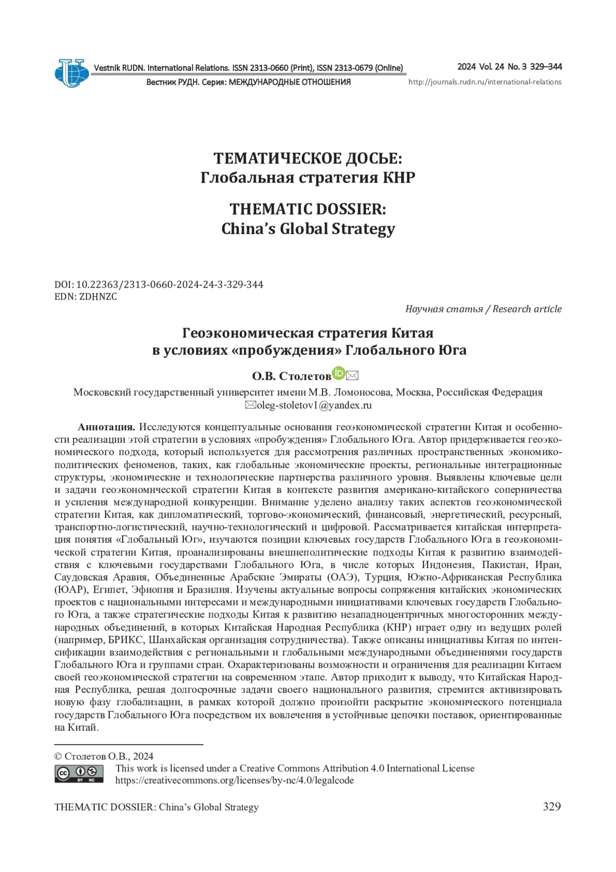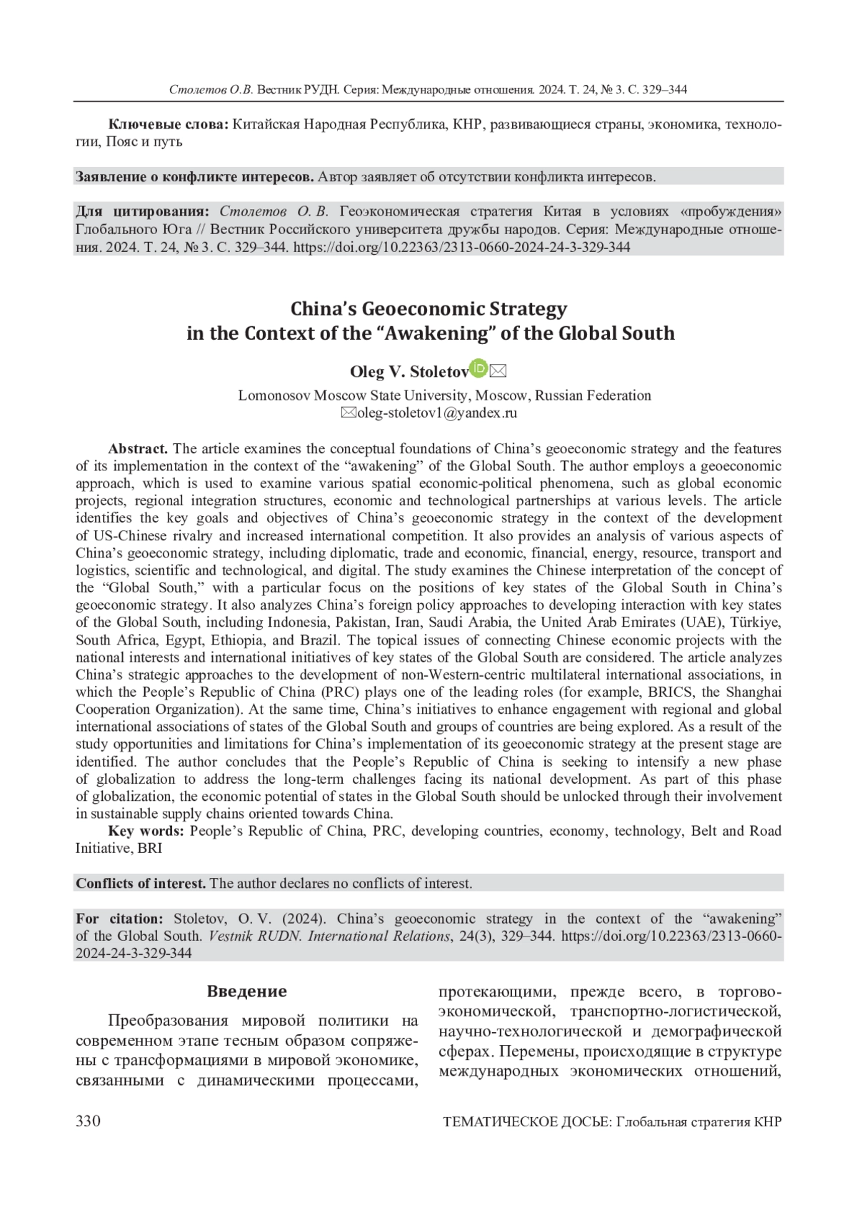 СТОЛЕТОВ О. В. ГЕОЭКОНОМИЧЕСКАЯ СТРАТЕГИЯ КИТАЯ В УСЛОВИЯХ "ПРОБУЖДЕНИЯ" ГЛОБАЛЬНОГО ЮГА // ВЕСТНИК РОССИЙСКОГО УНИВЕРСИТЕТА ДРУЖБЫ НАРОДОВ. СЕРИЯ: МЕЖДУНАРОДНЫЕ ОТНОШЕНИЯ. 2024. ТОМ 24 № 3