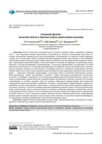 С начала 2000-х гг. Китай прилагает последовательные и настойчивые усилия по проникновению в Арктический регион и закреплению в нем в качестве полноценного участника международных политических и экономических процессов, претендуя на статус полноправного актора системы управления Арктикой. Актуальность темы исследования определяется стратегическим значением Арктики для интересов Российской Федерации и обусловленной этим потребностью выстраивать выверенный внешнеполитический курс на основе объективной оценки политики ключевых «игроков» в данном регионе, одним из которых становится Китай, наращивающий свое присутствие в Заполярье. Несмотря на значительное число работ российских и зарубежных исследователей по различным аспектам арктической политики Пекина, недостаточно изученным остается вопрос долгосрочных задач Китая в Арктике в контексте реализуемой им стратегии трансформации системы мирового управления. Автор ставит целью определение ключевых движущих факторов арктической политики Китайской Народной Республики (КНР) и оценку потенциальных угроз интересам России при реализации Китаем своих подходов к значимым вопросам будущего развития региона. Исследование осуществлено с опорой на теорию наступательного реализма, которая позволяет обосновывать высокую степень конкуренции мировых держав в геополитическом пространстве Арктики и объяснить значительный наступательный потенциал внешней политики Китая, в том числе на северном направлении. Использованы институциональный, логический методы и метод экспертной оценки. В основу положен системный подход к рассмотрению арктической политики КНР в совокупности ее различных элементов и меняющейся международной среды, а в более широком контексте - глобальной внешнеполитической стратегии Пекина. На основе анализа политики Китая на арктическом направлении за минувшее десятилетие выявляются риски, связанные с интенсивным привлечением китайского капитала в инфраструктурные проекты в высоких широтах и встраиванием российского северного логистического маршрута во всеобъемлющую китайскую инициативу «Пояс и путь», которая направлена на трансформацию мировой экономической системы и структуры международных отношений в интересах КНР.
