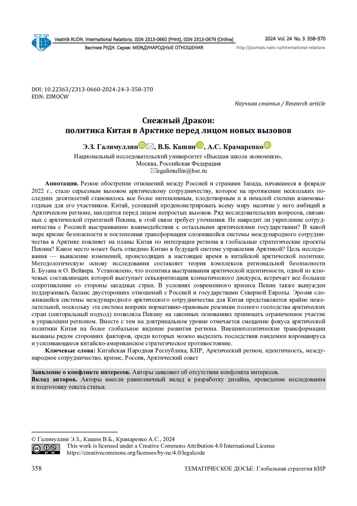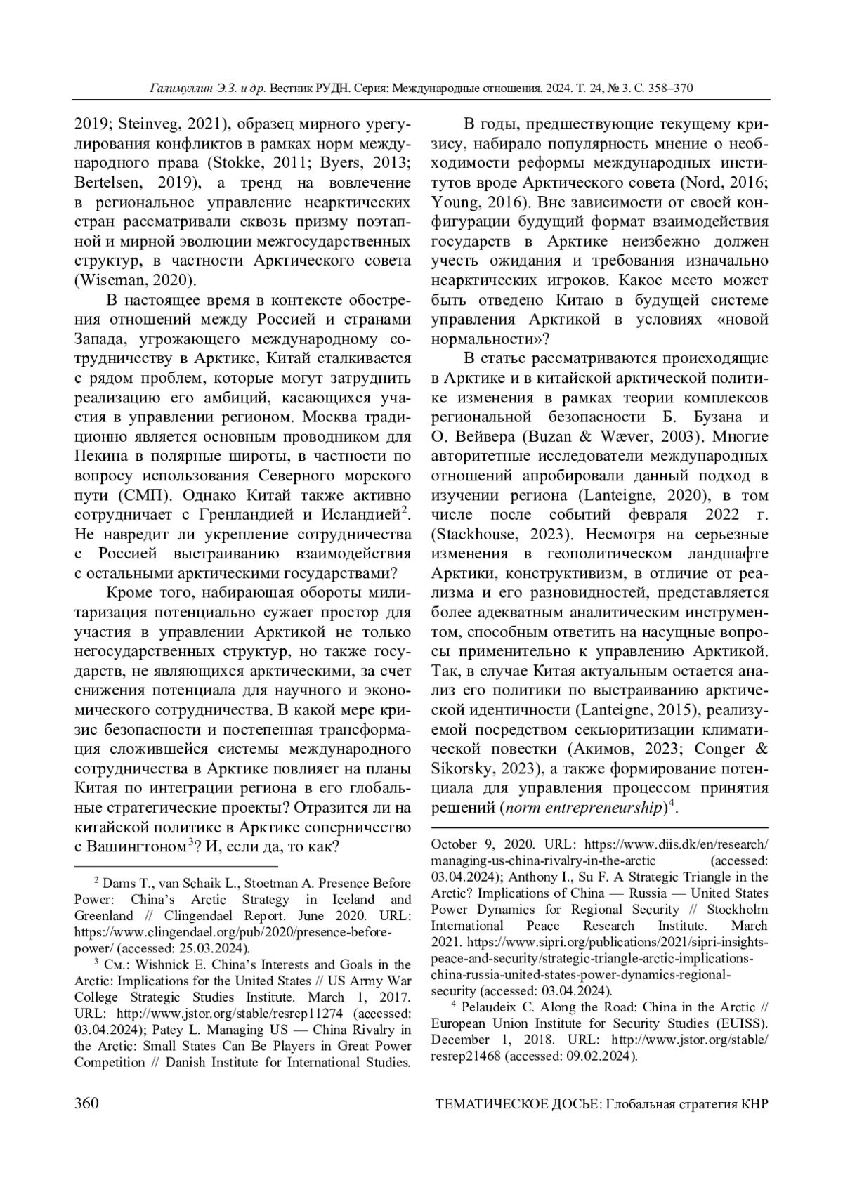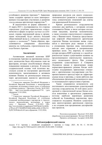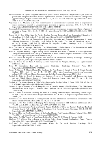 1. Акимов Р. Х. Арктика с китайской спецификой // Арктика и Север. 2023. № 50. С. 89-108. ;. DOI: 10.37482/issn2221-2698.2023.50.89 EDN: YASXGE