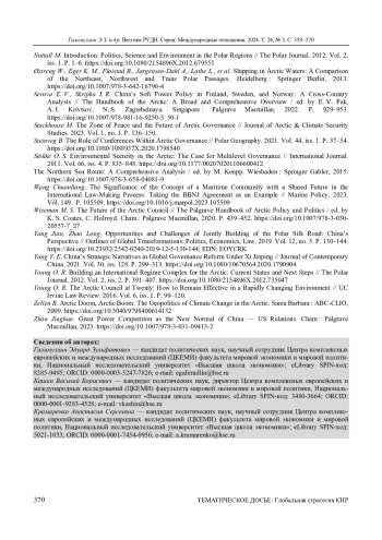 19. Lanteigne М. Considering the Arctic as a Security Region: The Roles of China and Russia // Routledge Handbook of Arctic Security / ed. by G. H. Gjørv, M. Lanteigne, S.-A. Horatio. London: Routledge, 2020. P. 311-323. DOI: 10.4324/9781315265797-26