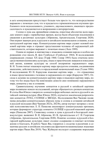 7. Ван Юнцзе. Концептосфера 三辰 / небесные светила в русской и китайской лингвокультурах // Педагогический журнал. 2024. Т. 14. № 3А. С. 78-88.