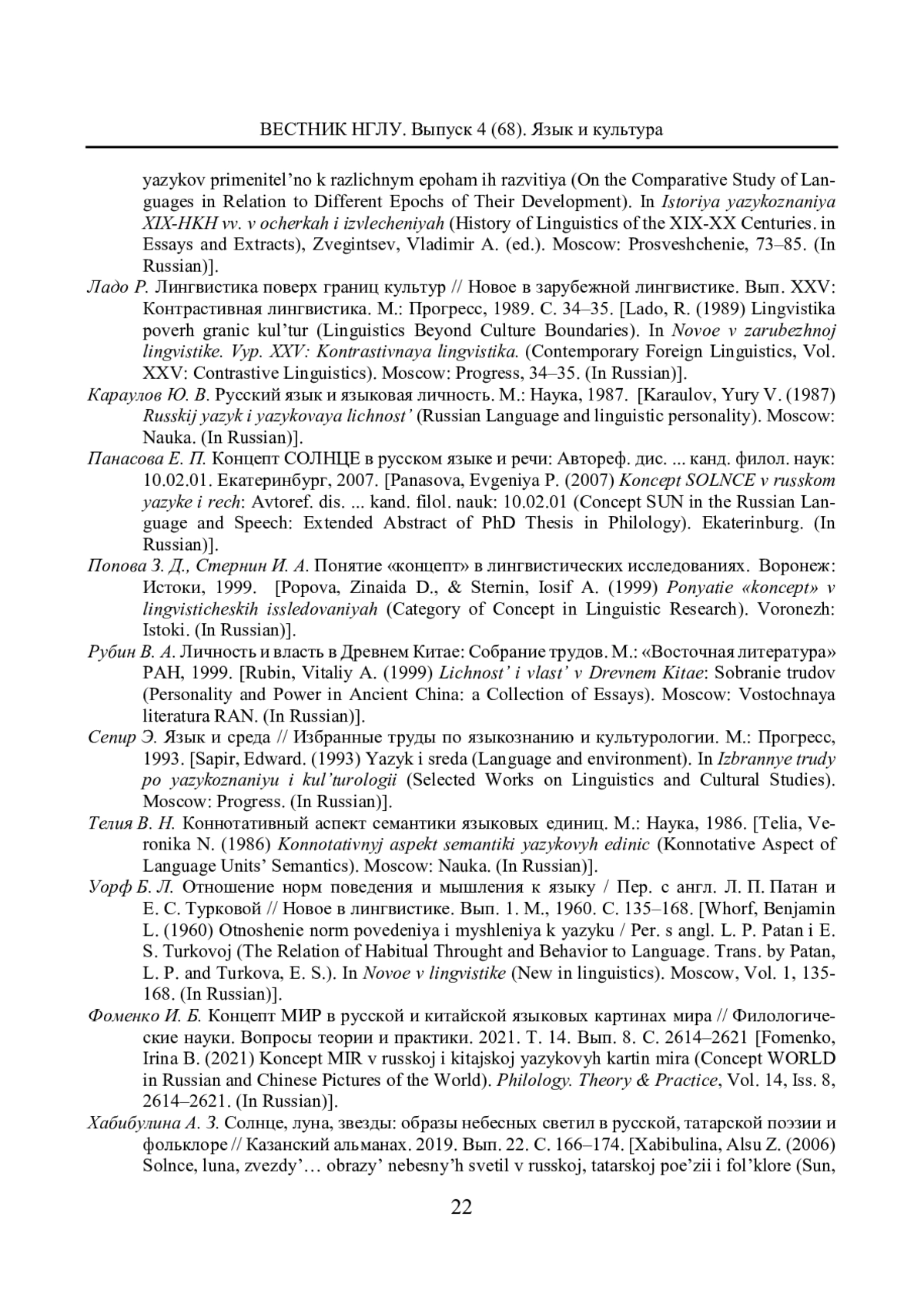 6. Ван Чжицян. Кросскультурный анализ концептов “СОЛНЦЕ” и “ЛУНА”: этнопсихологические аспекты речевой репрезентации // Современная наука: актуальные проблемы теории и практики. Серия: Гуманитарные науки. 2023b. № 7/2. С. 105-112.