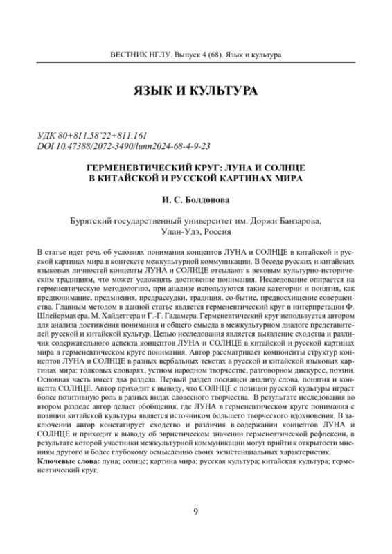 4. Болдонова И. С., Лю Сюэцин. Русские и китайские концепты в межкультурном диалоге: герменевтический подход // Вестник Бурятского государственного университета. Филология. 2024. Вып. 3. С. 25-33.