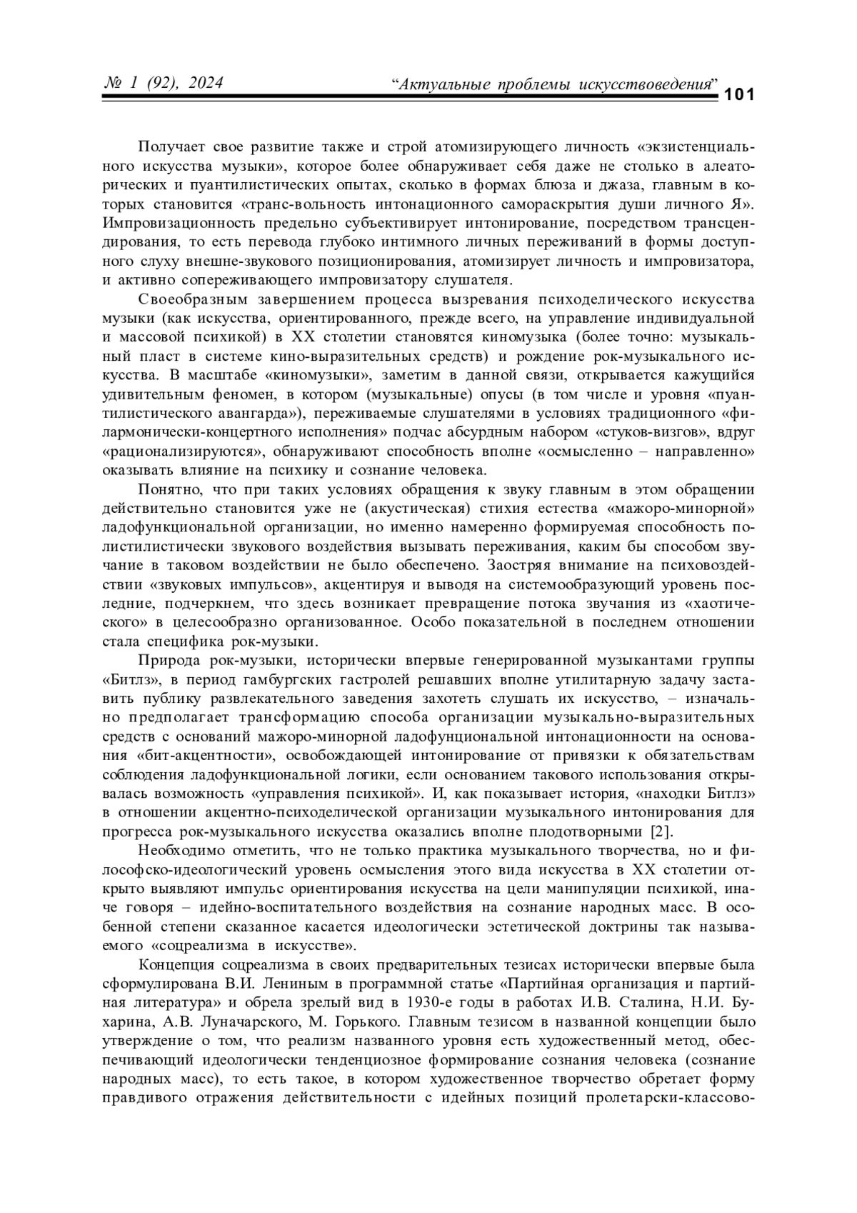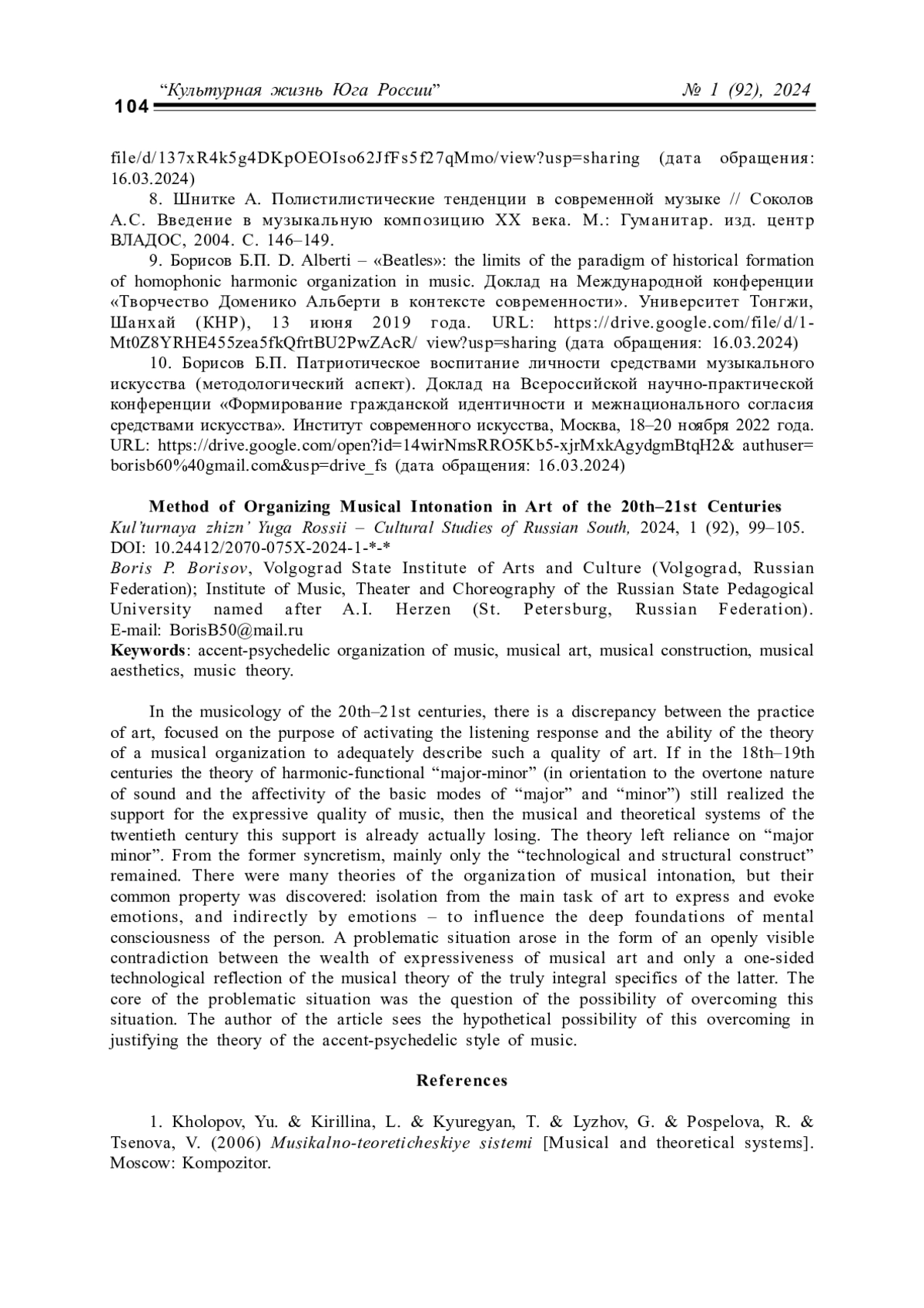 БОРИСОВ Б. П. СПОСОБ ОРГАНИЗАЦИИ МУЗЫКАЛЬНОГО ИНТОНИРОВАНИЯ В ИСКУССТВЕ XX-XXI СТОЛЕТИЙ // КУЛЬТУРНАЯ ЖИЗНЬ ЮГА РОССИИ. 2024. № 1 (92)