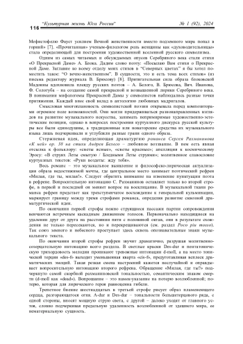 В статье рассматривается образ Далекой возлюбленной в романсах С. Рахманинова ор. 38 на стихи поэтов-символистов. В музыкальной науке проблема Русского Эроса на сегодняшний день не получила должного освещения. Цель статьи – выявить в романсах С. Рахманинова образы-знаки куртуазного текста. Подвергнув анализу романсы «К ней» и «Ау!», автор обнаружил, что в драматургии романсов отражен новый тип любовной лирики – синтез возвышенно-одухотворенного и религиозно-мистического начал, который соответствовал концепции «Вечной Женственности» Вл. Соловьёва