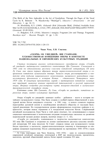 Статья посвящена анализу художественного своеобразия оперы «Скорбь об ушедшей» выдающегося китайского композитора Ши Гуаннаня. Сочиненная в 1981 году по одноименному рассказу классика кит айской литературы XX века Лу Синя, она стала первым образцом жанра лирико-психологической оперы в современном китайском музыкальном театре. Замысел оперы рассматривается в контексте идеи подъема национального самосознания, вызванного важнейшим социокультурным феноменом в истории Китая – «движением Четвертого мая» 1919 года. В концепции произведения, наряду с претворением китайских культурных традиций, выявлено влияние европейской (итальянской) и русской лирической оперы. Впервые подробно рассмотрены черты жанрово-стилевой и музыкальнодраматургической специфики оперы.
