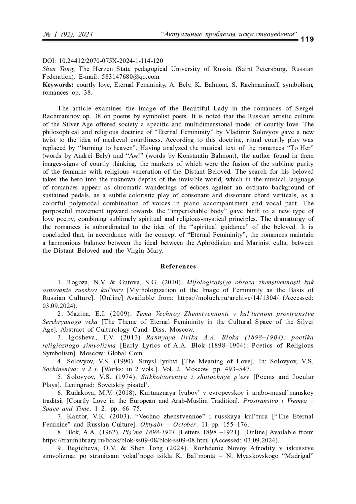 9. Бегичева О.В., Шэнь Тун. Рождение Новой Афродиты в искусстве символизма: по страницам вокального цикла К. Бальмонта - Н. Мясковского “Мадригал” // Искусство и образование. № 1. 2024. С. 24-31. EDN: IKGOPJ