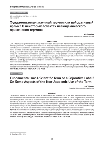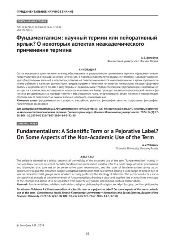 Статья посвящена критическому анализу обоснованности расширенного применения термина «фундаментализм» преимущественно в неакадемических источниках. В последние десятилетия фундаментализмом называют широкий круг общественных явлений и идеологем, которые на поверку оказываются консервативными, а ярлык фундаментализма работает в качестве возможности придать предмету полемики негативную коннотацию, которая сформировалась у широкого круга людей в силу борьбы с радикальными террористическими группировками, некоторые из которых и в самом деле исповедовали идеологию исламизма. Автор проводит социально-философский анализ феномена фундаментализма, проводя четкую и обоснованную грань, очерчивающую объем понятия и позволяющую отделить его от поверхностно схожих явлений, например, консерватизма.