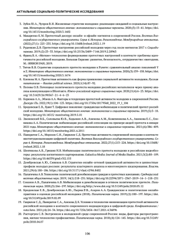 10. Керимов А. А., Эбзеев А. А. Факторы и тенденции протестной активности молодежи в современной России. Дискурс-Пи. 2022;19(1):104-123. https://doi.org/10.17506/18179568_2022_19_1_104