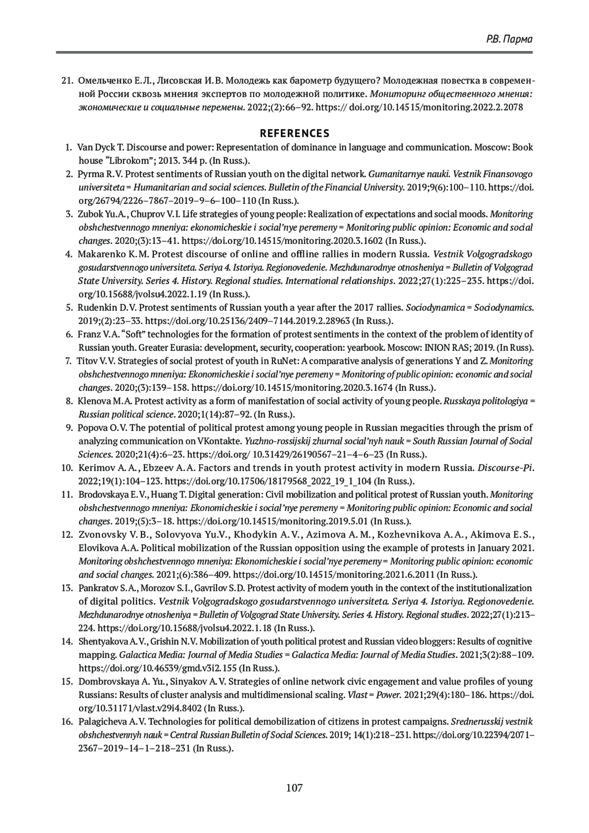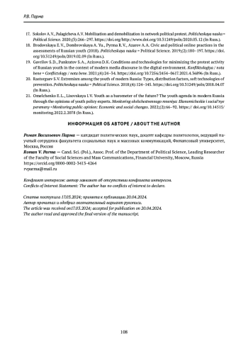19. Гаврилов С. Д., Панкратов С. А., Азизова Д. К. Условия и технологии минимизации протестной активности российской молодежи в контексте современного медиадискурса в цифровой среде. Конфликтология / nota bene. 2021;(4):24-34. https://doi.org/10.7256/2454-0617.2021.4.36896