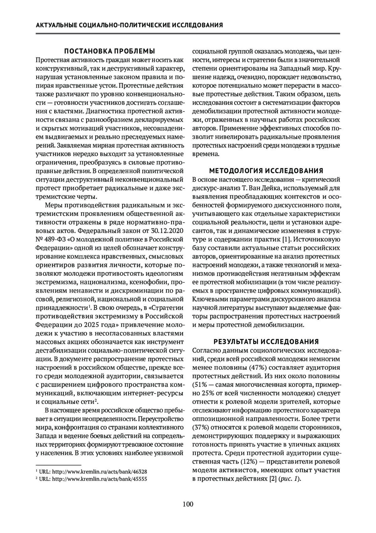 В статье протестные настроения дифференцированы по характеру конструктивности и конвенциональности. Деструктивные и неконвенциальные протестные настроения часто выливаются в экстремистские и радикальные действия, которые представляют угрозу устойчивому развитию общества. Протестная аудитория молодежи подразделяется на заряженных активистов, ситуативных сторонников и пассивных наблюдателей. Дискурс-анализ современных научных исследований выявил преобладание в формировании протестных настроений информационных, социальных, политических и психологических факторов. Дискурсивные предложения исследователей сопоставляются с социологическими данными, раскрывающими представления российской молодежи о нужных способах развития общественной активности. В зависимости от типов политической ориентации определяются возможные стратегии демобилизации радикальных протестных настроений, которые строятся на основании общественного участия и доступа к ресурсам.