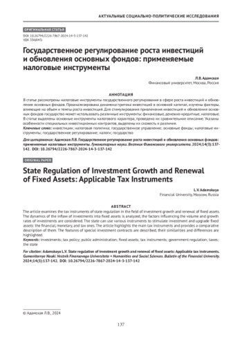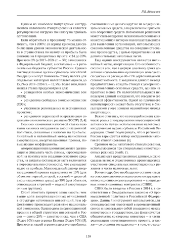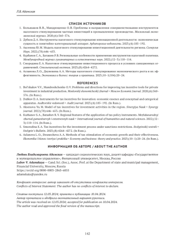 1. Большаков В. В., Мандрощенко О. В. Проблемы и направления совершенствования инструментов налогового стимулирования частных инвестиций в промышленное производство. Московский экономический журнал. 2020;(6):560-576.