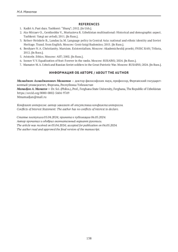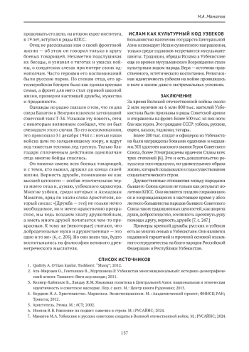 7. Маматов М. А. Узбекские и русские советские солдаты в Великой отечественной войне. М.: РУСАЙНС; 2024.