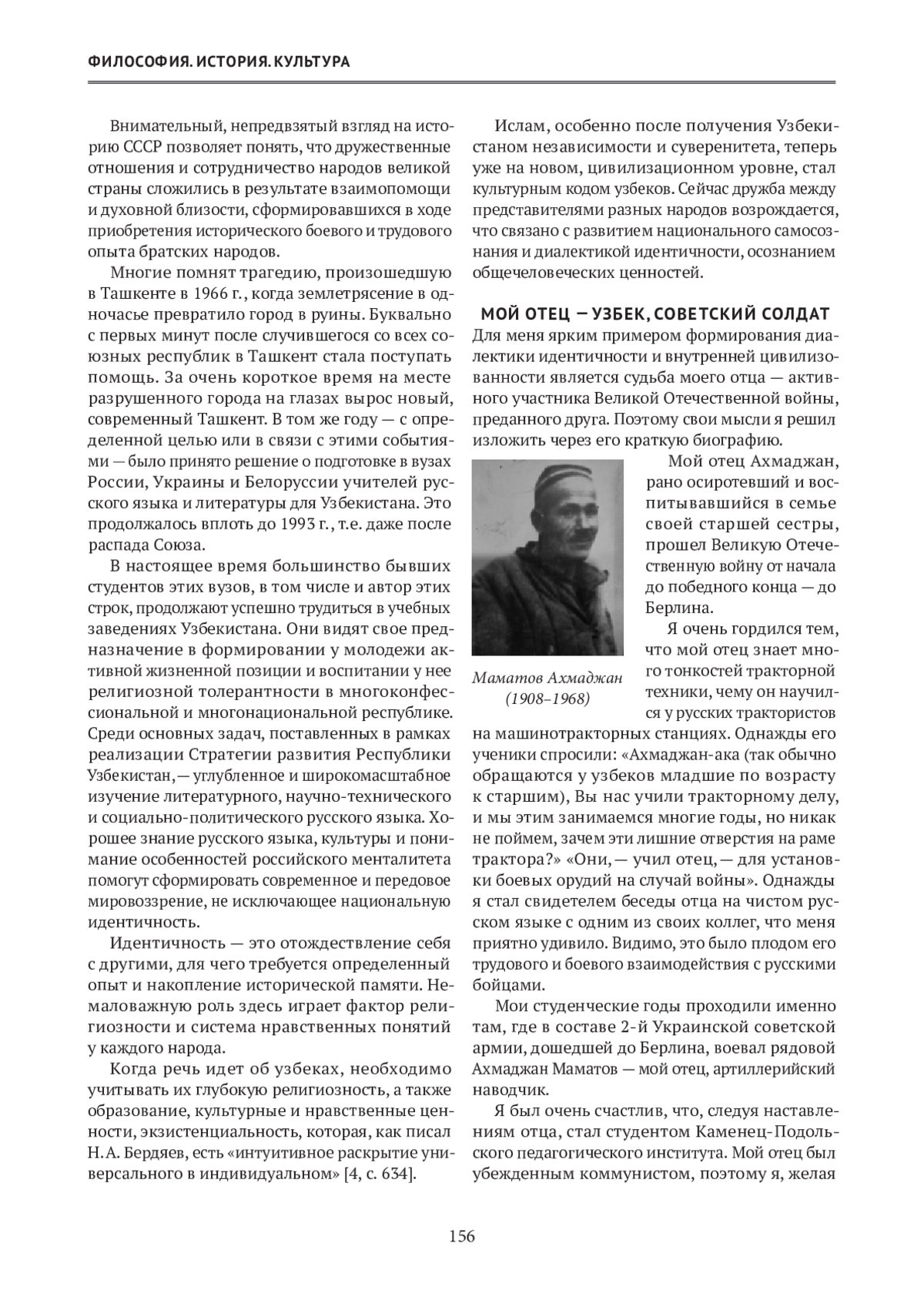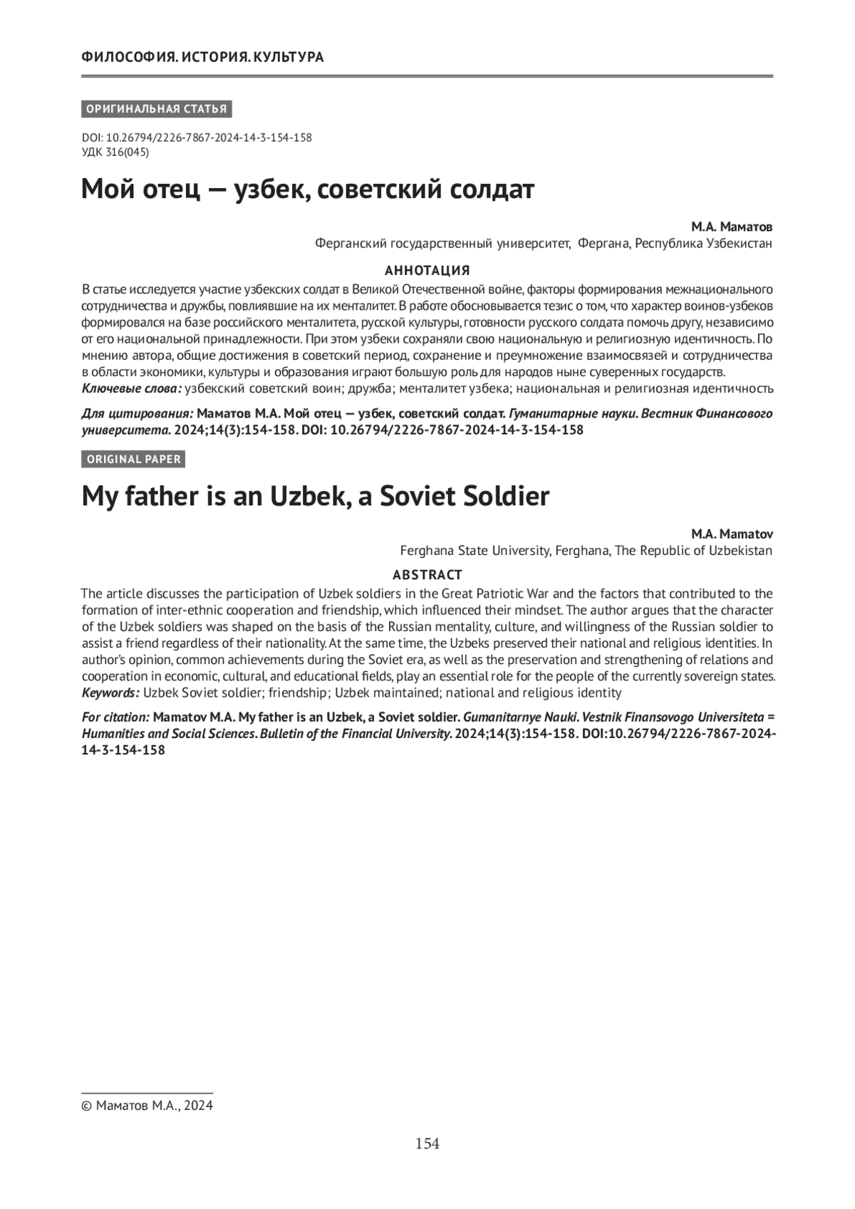 В статье исследуется участие узбекских солдат в Великой Отечественной войне, факторы формирования межнационального сотрудничества и дружбы, повлиявшие на их менталитет. В работе обосновывается тезис о том, что характер воинов-узбеков формировался на базе российского менталитета, русской культуры, готовности русского солдата помочь другу, независимо от его национальной принадлежности. При этом узбеки сохраняли свою национальную и религиозную идентичность. По мнению автора, общие достижения в советский период, сохранение и преумножение взаимосвязей и сотрудничества в области экономики, культуры и образования играют большую роль для народов ныне суверенных государств.