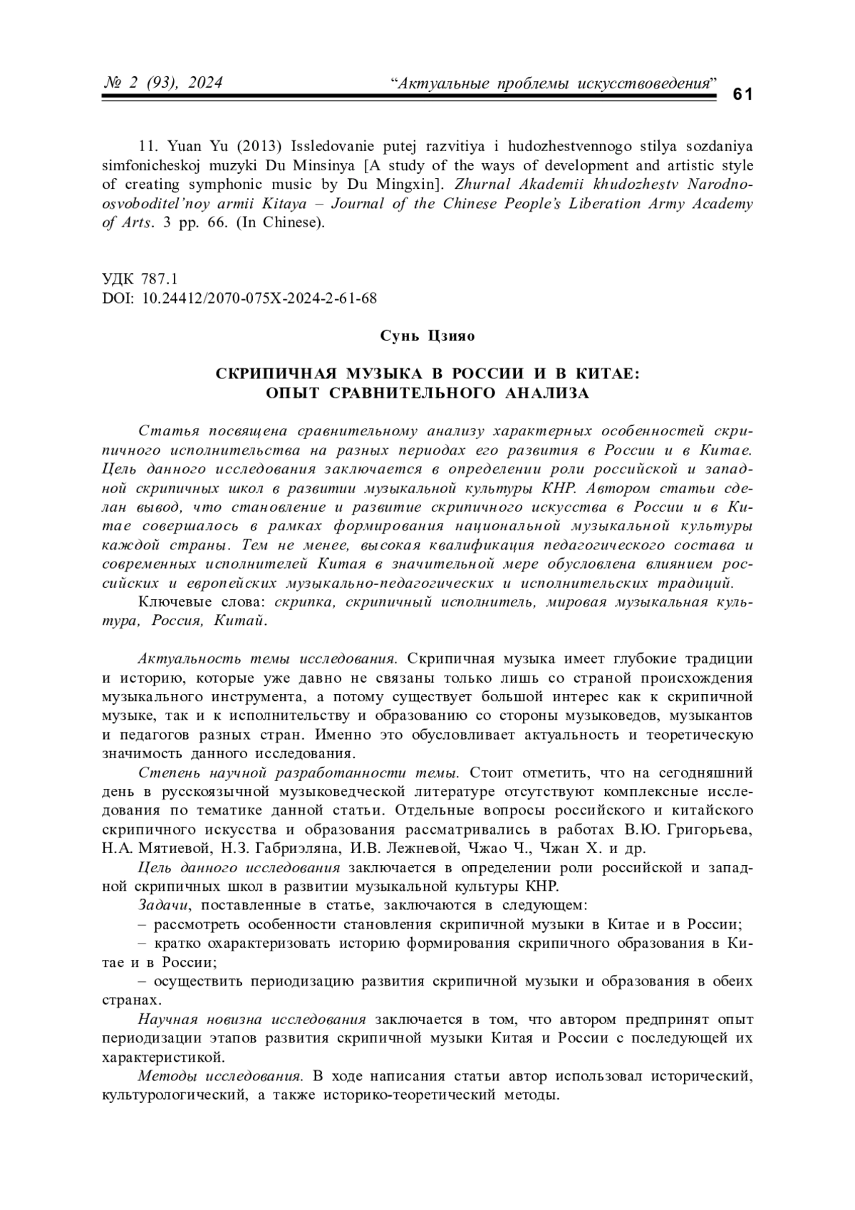 Статья посвящена сравнительному анализу характерных особенностей скрипичного исполнительства на разных периодах его развития в России и в Китае. Цель данного исследования заключается в определении роли российской и западной скрипичных школ в развитии музыкальной культуры КНР. Автором статьи сделан вывод, что становление и развитие скрипичного искусства в России и в Китае совершалось в рамках формирования национальной музыкальной культуры каждой страны. Тем не менее, высокая квалификация педагогического состава и современных исполнителей Китая в значительной мере обусловлена влиянием российских и европейских музыкально-педагогических и исполнительских традиций