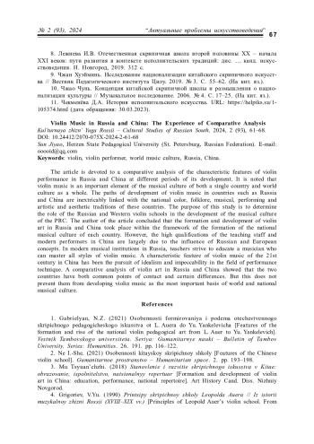 1. Габриэлян Н.З. Особенности формирования и подъема отечественного скрипичного педагогического искусства от Л. Ауэра до Ю. Янкелевича // Вестник Тамбовского университета. Серия: Гуманитарные науки. 2021. Т. 26. № 191. С. 116-122. EDN: AABBSY