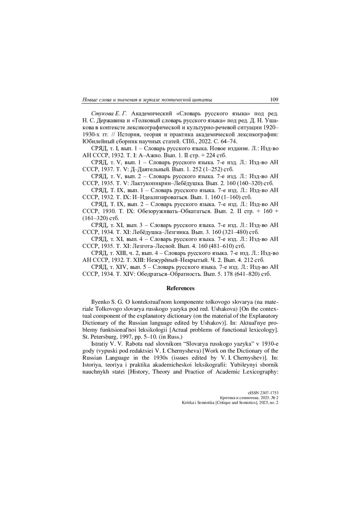 4. Приемышева М. Н., Стукова Е. Г. Академический “Словарь русского языка” под редакцией академика Н. С. Державина (1929-1937 гг.) в истории русской толковой лексикографии // Вопросы лексикографии. 2020. № 17. С. 195-212. DOI: 10.17223/22274200/17/10
