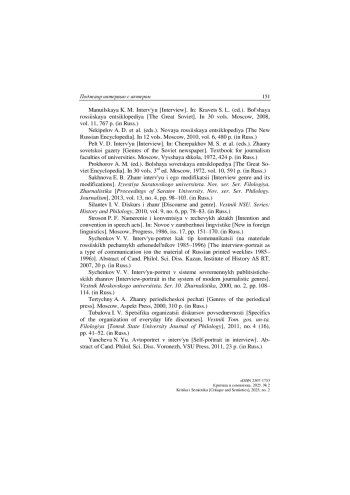 17. Сыченков В. В. Интервью-портрет как тип коммуникации (на материале российских печатных еженедельников 1985-1996): Автореф. дис. … канд. филол. наук. Казань: Ин-т истории АН РТ, 2007. 20 с.