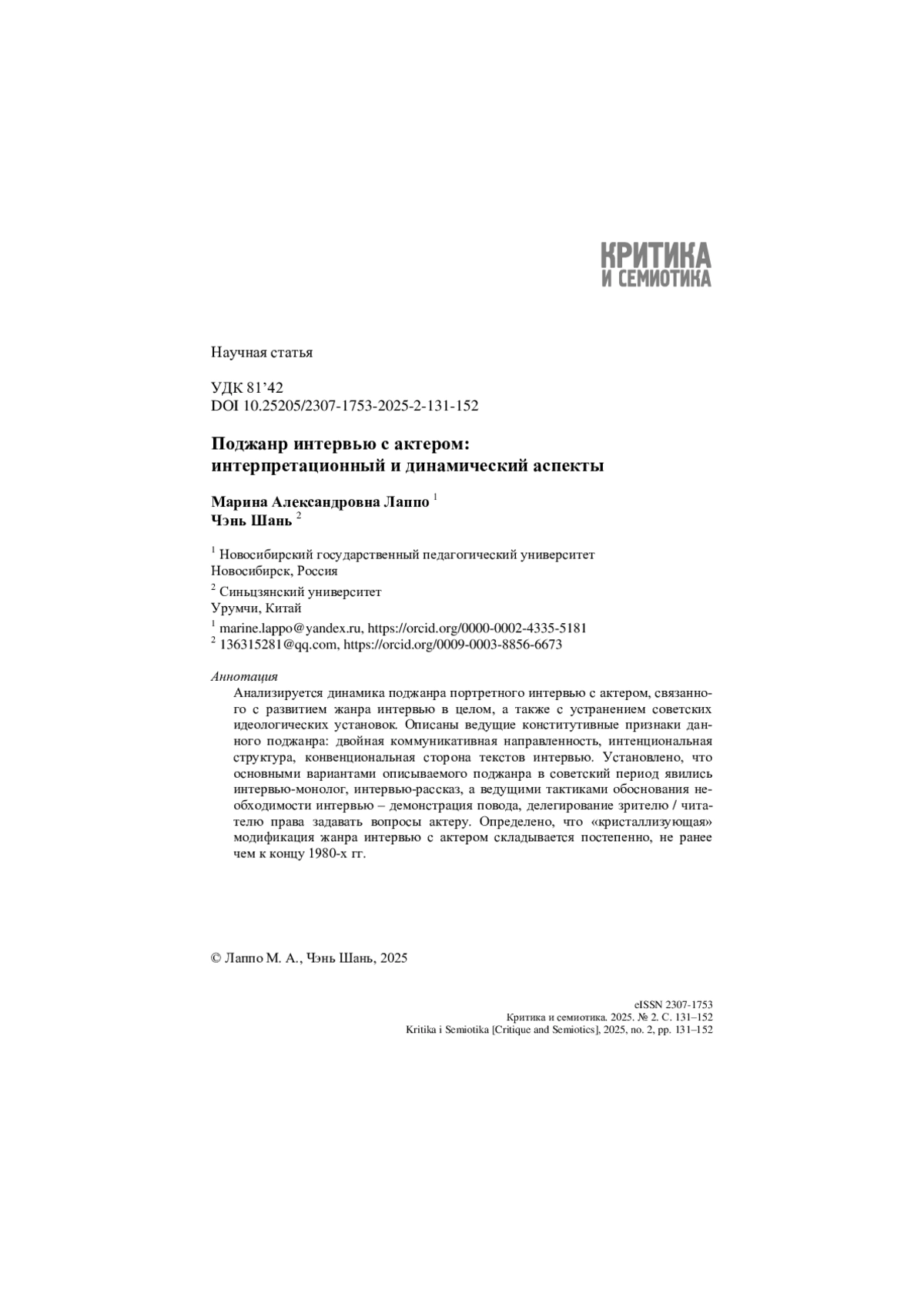 20. Чэнь Ш. Языковая личность российского актера в зеркале самопрезентации (на фоне языковой личности китайского актера) // Филология: научные исследования. 2025. № 4. С. 196-208.