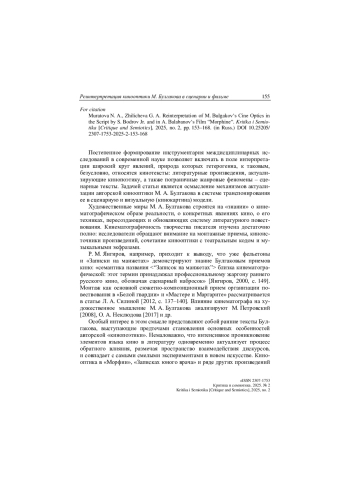 Постепенное формирование инструментария междисциплинарных исследований в современной науке позволяет включать в поле интерпретации широкий круг явлений, природа которых гетерогенна, к таковым, безусловно, относятся кинотексты: литературные произведения, актуализирующие кинопоэтику, а также пограничные жанровые феномены – сценарные тексты. Задачей статьи является осмысление механизмов актуализации авторской кинооптики М. А. Булгакова в системе транспонирования ее в сценарную и визуальную (кинокартина) модели.
