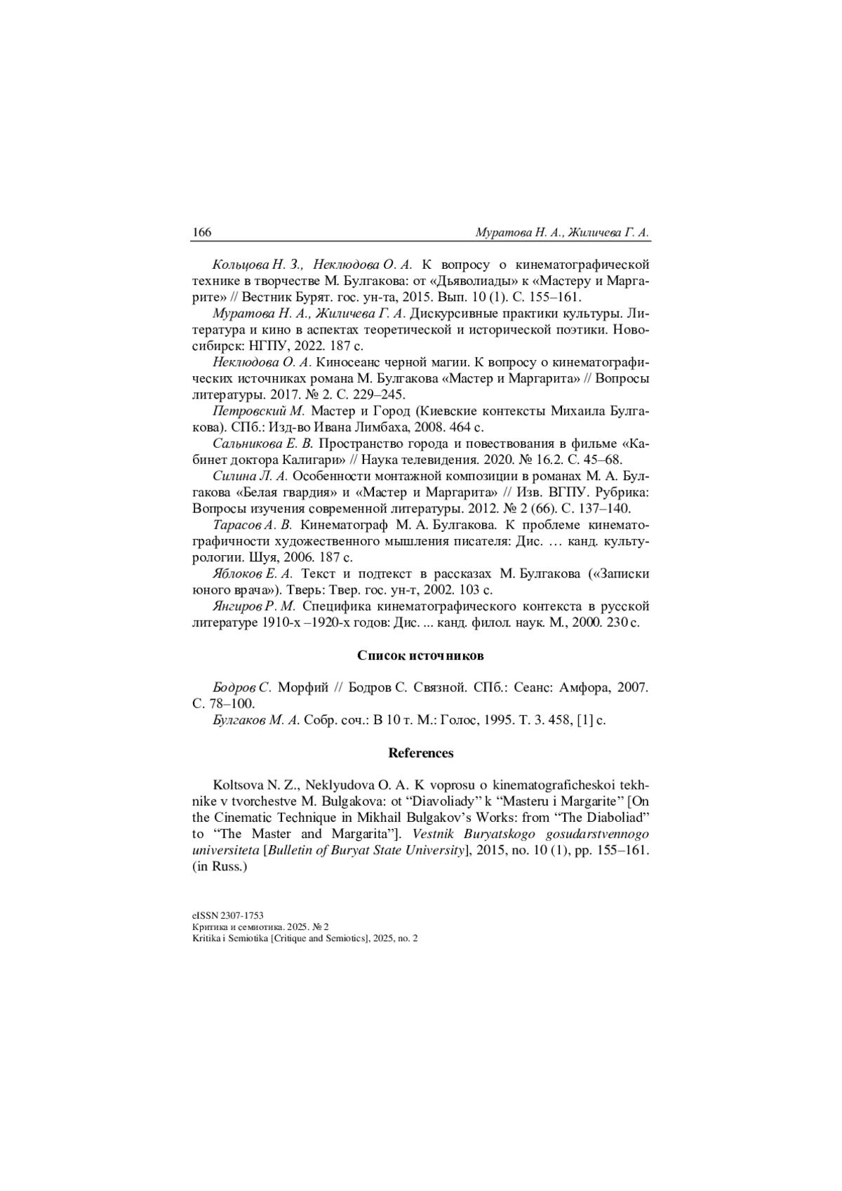 2. Кольцова Н. З., Неклюдова О. А. К вопросу о кинематографической технике в творчестве М. Булгакова: от “Дьяволиады” к “Мастеру и Маргарите” // Вестник Бурят. гос. ун-та, 2015. Вып. 10 (1). С. 155-161.