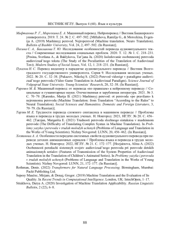 17. Мифтахова Р. Г., Морозкина Е. А. Машинный перевод. Нейроперевод // Вестник Башкирского университета. 2019. Т. 24. № 2. С. 497-502. EDN: VWVCPH