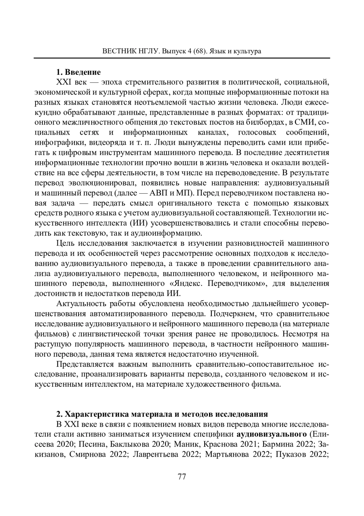 XXI век — эпоха стремительного развития в политической, социальной, экономической и культурной сферах, когда мощные информационные потоки на разных языках становятся неотъемлемой частью жизни человека. Люди ежесекундно обрабатывают данные, представленные в разных форматах: от традиционного межличностного общения до текстовых постов на билбордах, в СМИ, социальных сетях и информационных каналах, голосовых сообщений, инфографики, видеоряда и т. п. Люди вынуждены переводить сами или прибегать к цифровым инструментам машинного перевода. В последние десятилетия информационные технологии прочно вошли в жизнь человека и оказали воздействие на все сферы деятельности, в том числе на переводоведение. В результате перевод эволюционировал, появились новые направления: аудиовизуальный и машинный перевод (далее — АВП и МП). Перед переводчиком поставлена новая задача — передать смысл оригинального текста с помощью языковых средств родного языка с учетом аудиовизуальной составляющей. Технологии искусственного интеллекта (ИИ) усовершенствовались и стали способны переводить как текстовую, так и аудиоинформацию.