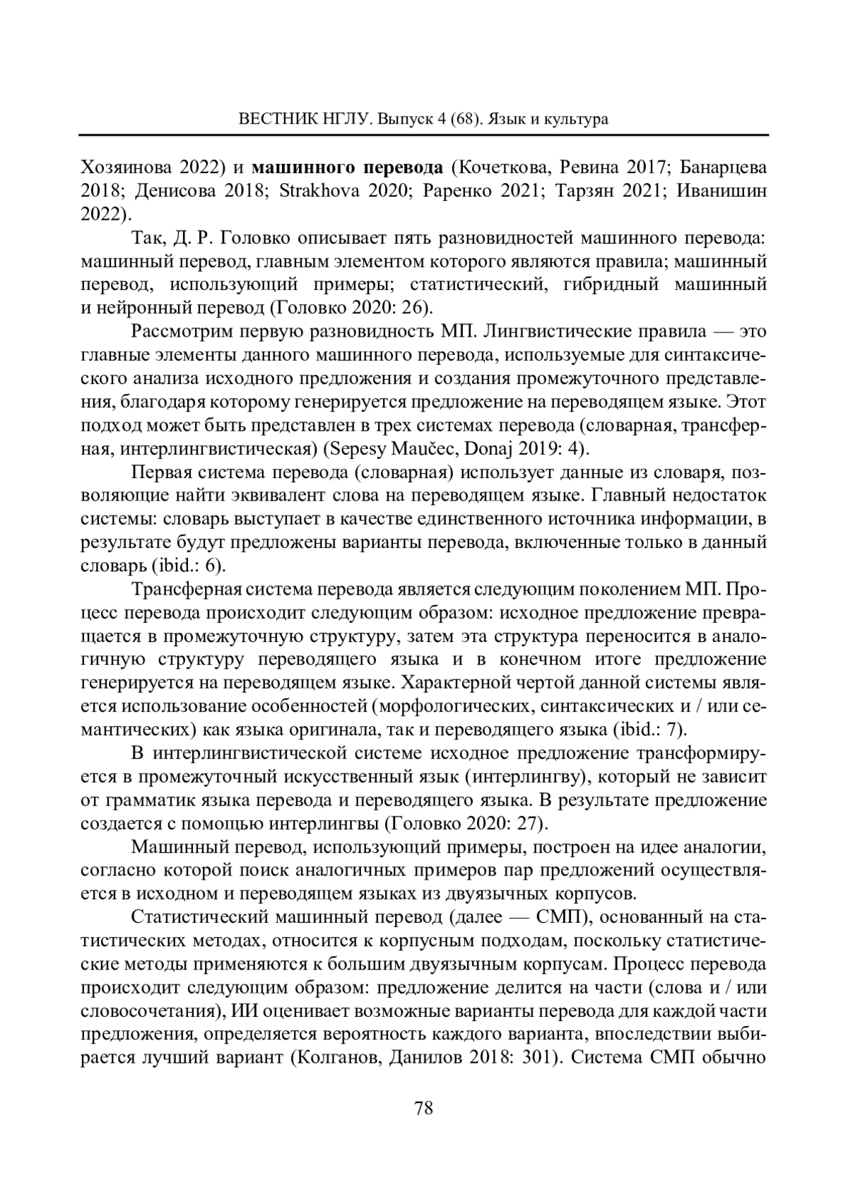 3. Головко Д. Р. Особенности и виды машинного перевода // Вестник Московского информационно-технологического университета - Московского архитектурно-строительного института. 2020. № 4. С. 24-30. EDN: GVOHNH