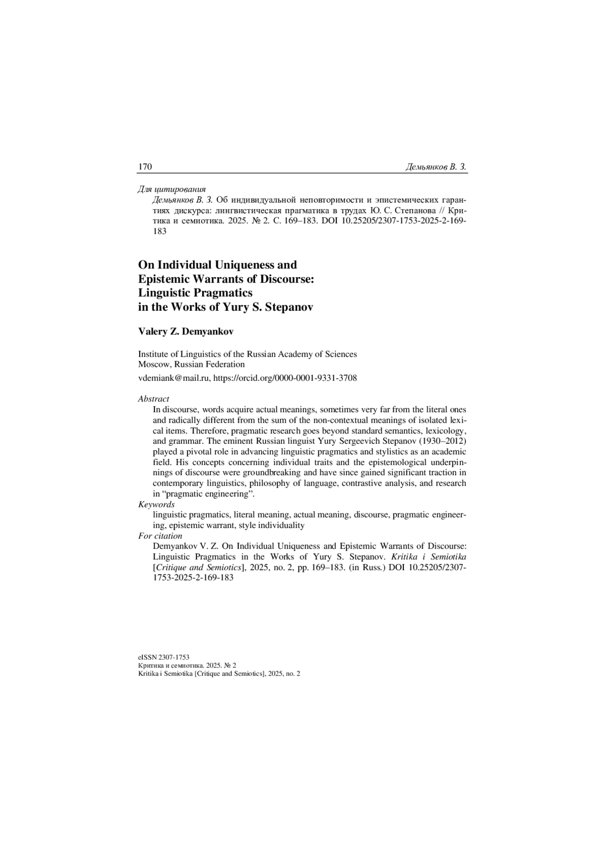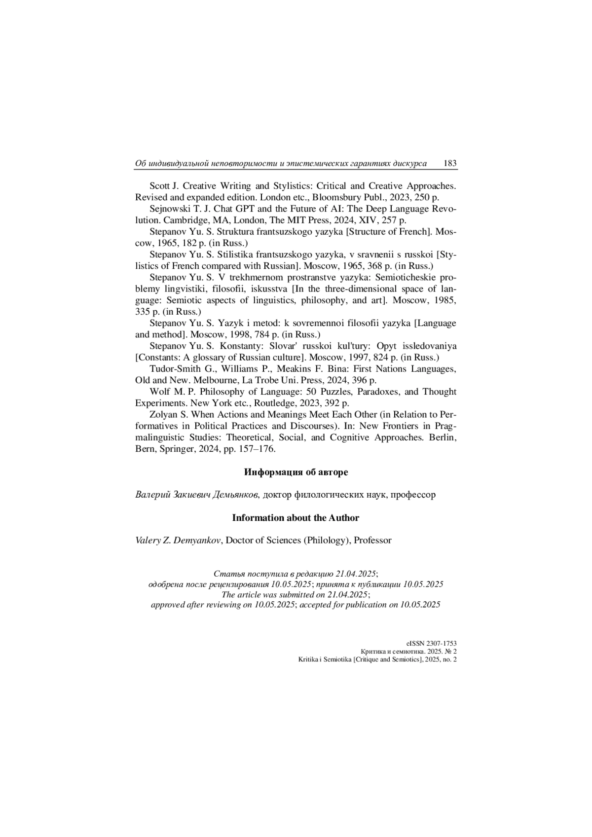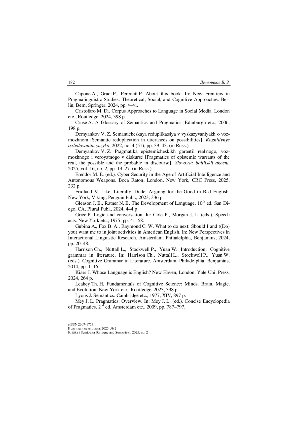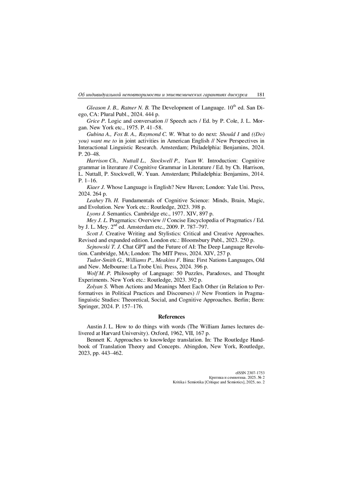 2. Демьянков В. З. Прагматика эпистемических гарантий реального, возможного и вероятного в дискурсе // Слово.ру: балтийский акцент. 2025. Т. 16, № 2. С. 13-27.