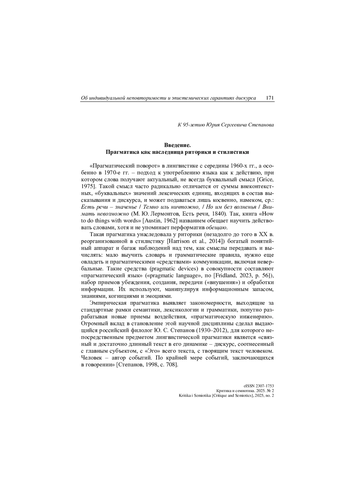 В дискурсе слова получают актуальный смысл, иногда очень далекий от буквального и радикально отличный от суммы внеконтекстных значений лексических единиц. Поэтому прагматическое исследование выходит за рамки стандартных семантики, лексикологии и грамматики. Огромный вклад в становление лингвистической прагматики как научной дисциплины сделал выдающийся российский филолог Юрий Сергеевич Степанов (1930–2012). Его идеи, связанные с индивидуальными чертами и эпистемическими основами дискурса, опередили свое время и получили широкое распространение в современной теории языка, в философии языка, в контрастивном анализе и в практических разработках в области «прагматической инженерии».