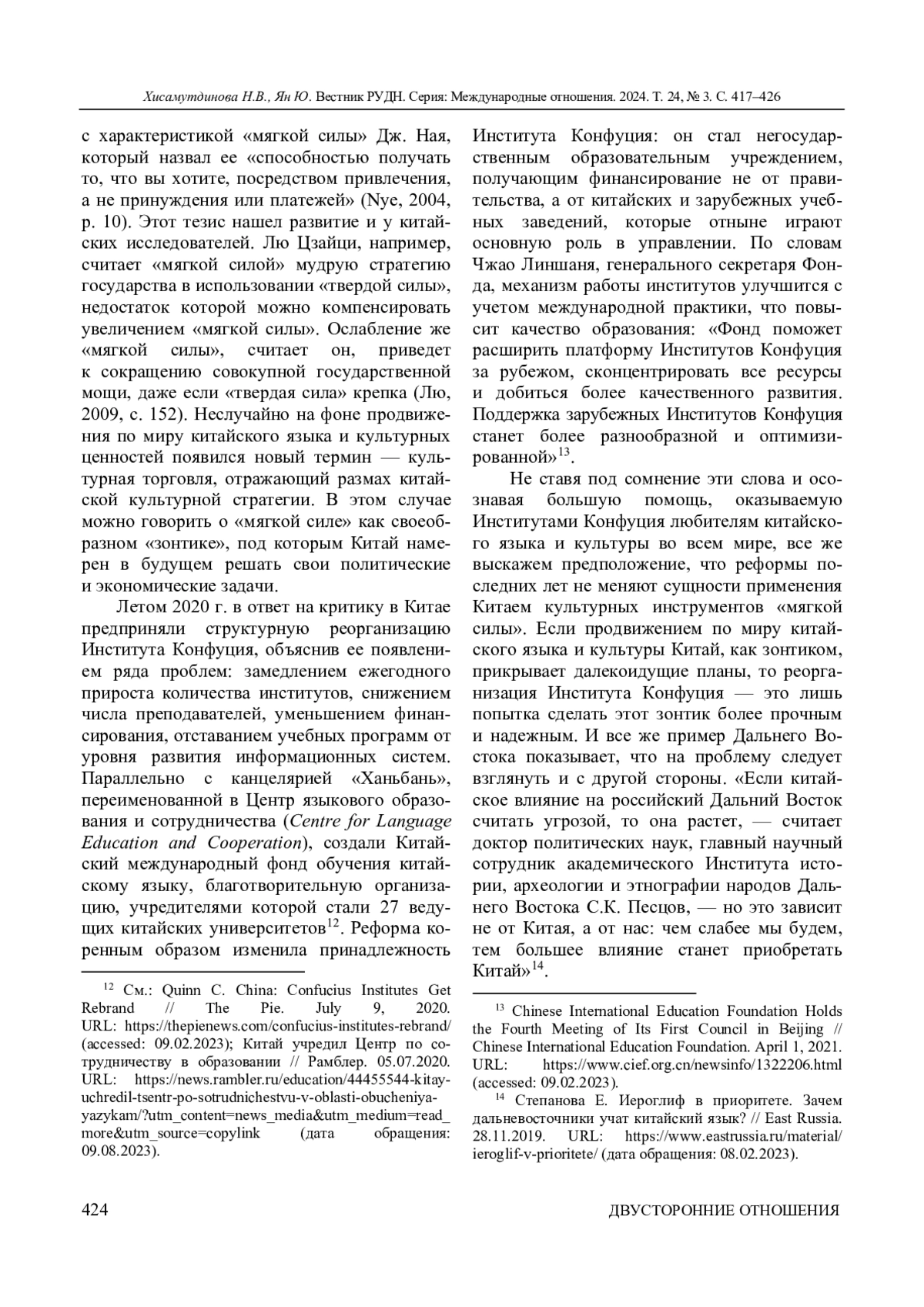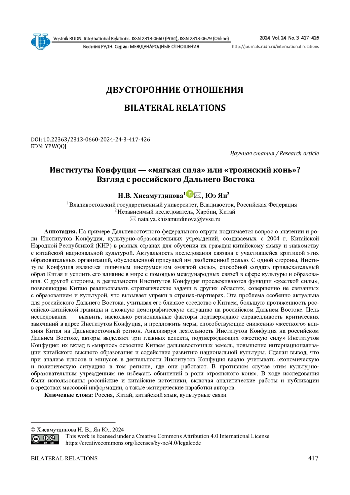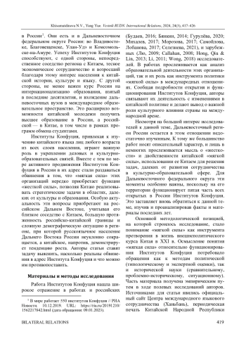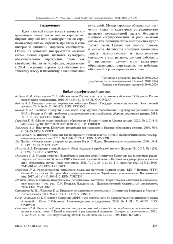 3. Byankin, K. Yu. (2014). Confucius Institute and its place in cultural globalization and cultural regionalization of PRC. Rossiya i Kitai: Problemy Strategicheskogo Vzaimodeistviya: Sbornik Vostochnogo Tsentra, (15), 145-149. (In Russian). EDN: SXKNQT