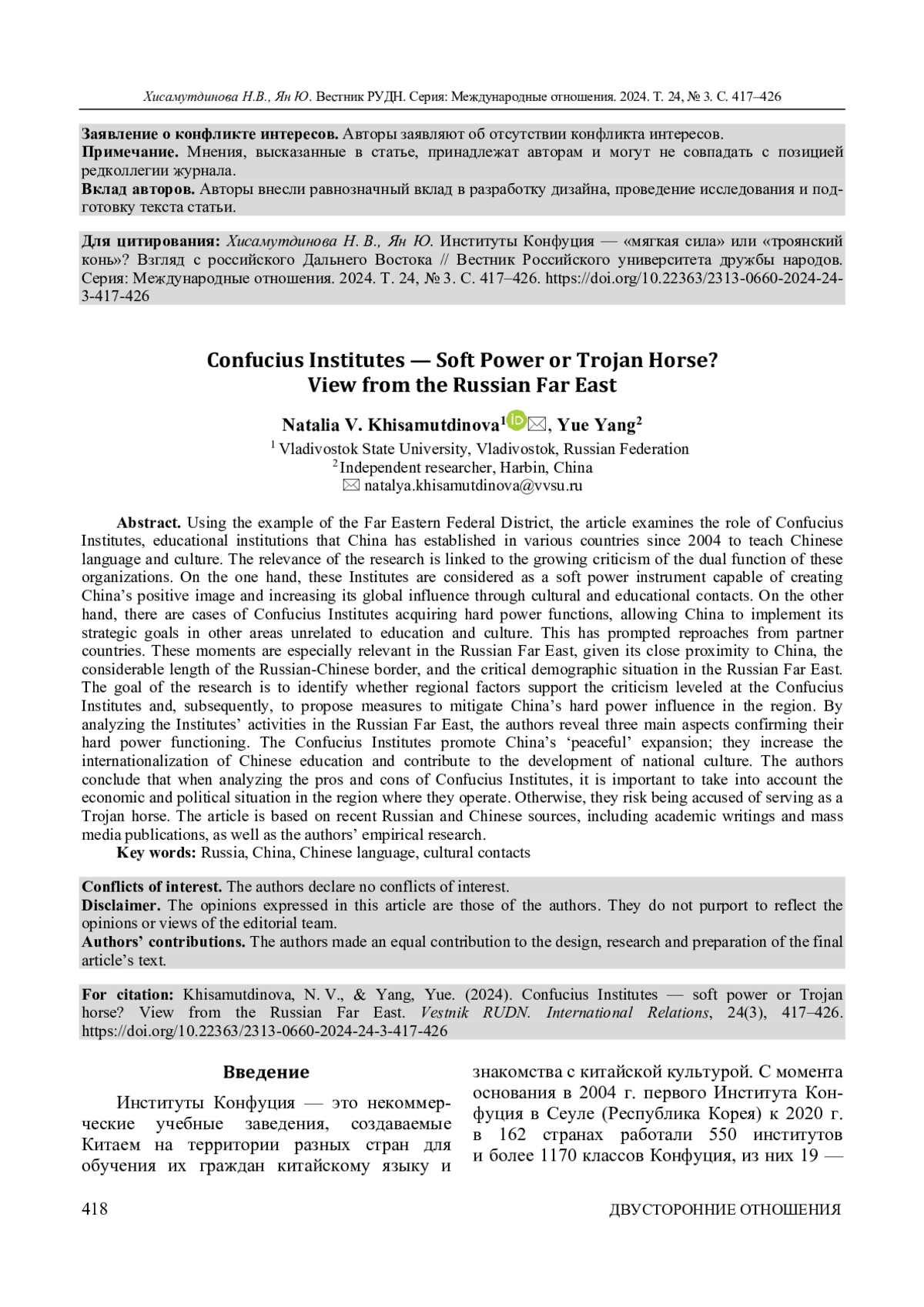 На примере Дальневосточного федерального округа поднимается вопрос о значении и роли Институтов Конфуция, культурно-образовательных учреждений, создаваемых c 2004 г. Китайской Народной Республикой (КНР) в разных странах для обучения их граждан китайскому языку и знакомству с китайской национальной культурой. Актуальность исследования связана с участившейся критикой этих образовательных организаций, обусловленной присущей им двойственной ролью. С одной стороны, Институты Конфуция являются типичным инструментом «мягкой силы», способной создать привлекательный образ Китая и усилить его влияние в мире с помощью международных связей в сфере культуры и образования. С другой стороны, в деятельности Институтов Конфуция прослеживаются функции «жесткой силы», позволяющие Китаю реализовывать стратегические задачи в других областях, совершенно не связанных с образованием и культурой, что вызывает упреки в странах-партнерах. Эта проблема особенно актуальна для российского Дальнего Востока, учитывая его близкое соседство с Китаем, большую протяженность российско-китайской границы и сложную демографическую ситуацию на российском Дальнем Востоке.