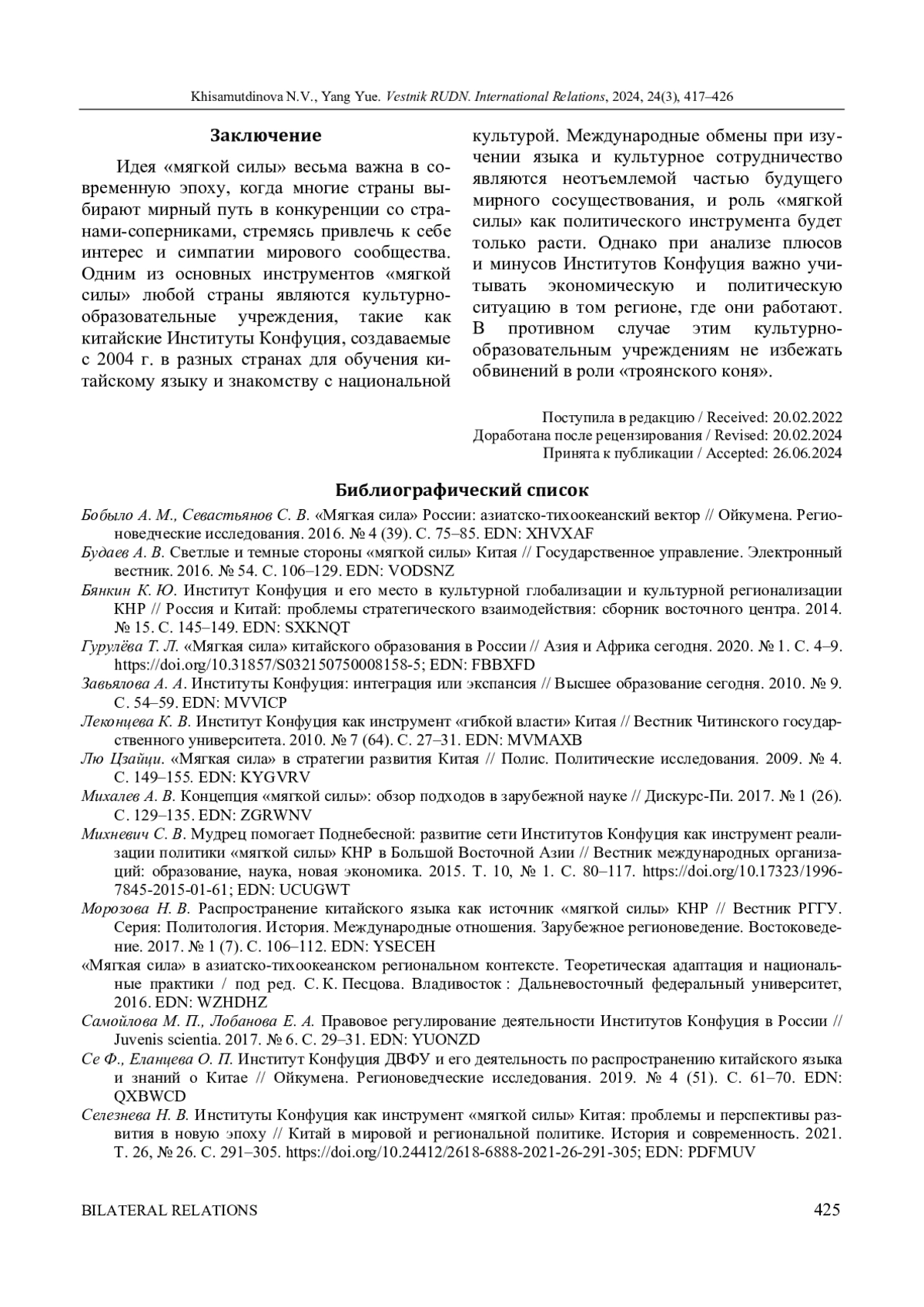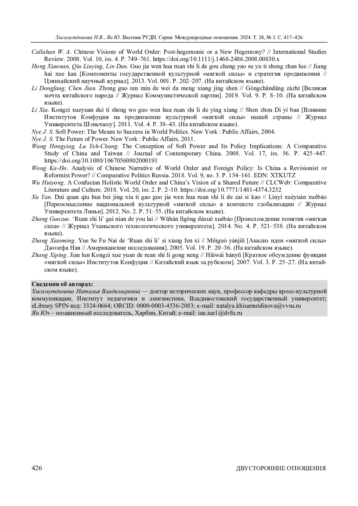 19. Selezneva, N. V. (2021). Confucius Institutes as a tool of China’s “soft power”: Problems and prospects of development in a new era. China in World and Regional Politics. History and Modernity, 26(26), 291-305. (In Russian). ;. DOI: 10.24412/2618-6888-2021-26-291-305 EDN: PDFMUV