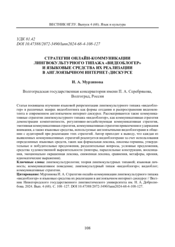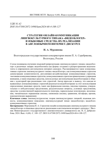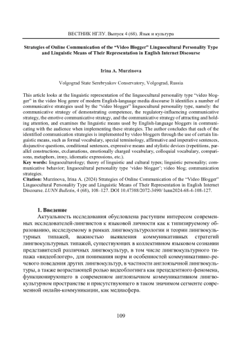Статья посвящена изучению языковой репрезентации лингвокультурного типажа «видеоблогер» в различных жанрах видеоблогинга как формы создания и распространения видеоконтента в современном англоязычном интернет-дискурсе. Рассматриваются такие коммуникативные стратегии лингвокультурного типажа «видеоблогер», как коммуникативная стратегия демонстрации компетентности, регулятивно-воздействующая коммуникативная стратегия, эмотивная коммуникативная стратегия, коммуникативная стратегия привлечения и удержания внимания, а также языковые средства, используемые англоязычными видеоблогерами в общении с аудиторией при реализации этих стратегий. Автор приходит к выводу, что каждая из выявленных коммуникативных стратегий реализуется видеоблогерами за счет использования определенных языковых средств, таких как формальная лексика, лексемы-термины, утвердительные и побудительные предложения, разделительные вопросы, условные предложения, средства художественной выразительности (повторы, параллельные конструкции, восклицания, эмоционально окрашенная лексика, сниженная лексика, сравнения, метафоры, ирония, идиоматические выражения).