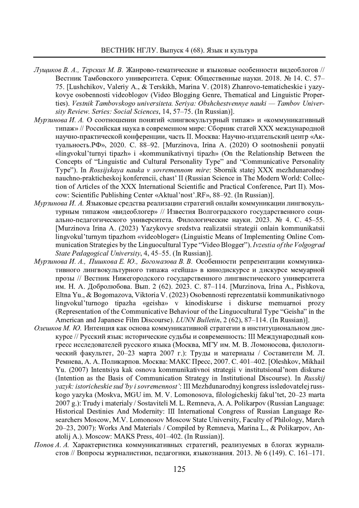 17. Мурзинова И. А. Языковые средства реализации стратегий онлайн коммуникации лингвокультурным типажом “видеоблогер” // Известия Волгоградского государственного социально-педагогического университета. Филологические науки. 2023. № 4. С. 45-55. EDN: QNJZOA