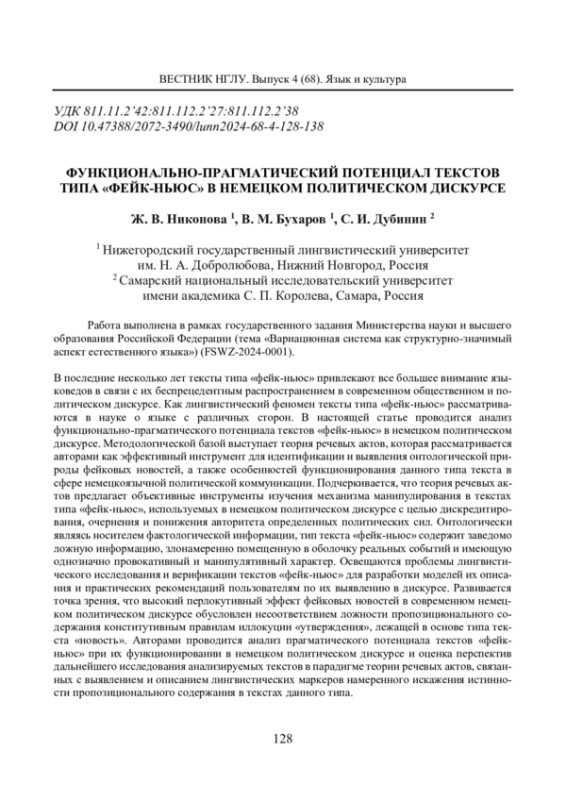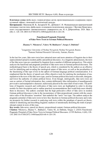 11. Никонова Ж. В., Соловьева Е. В. Проблемные вопросы лингвистического анализа текстов типа “фейк-ньюс” (на примере немецкого политического дискурса) // Вестник Нижегородского государственного лингвистического университета им. Н.А. Добролюбова. Спецвыпуск, 2020. С. 93-102.