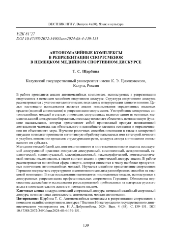 В работе проводится анализ антономазийных комплексов, используемых в репрезентации спортсменок в немецком медийном спортивном дискурсе. Структура спортивного дискурса рассматривается с учетом методологических подходов к интерпретации данного понятия. Целью настоящего исследования является анализ использования определенных языковых средств (моделей антономазии) в репрезентации спортсменок. Употребление конкретных антономазийных моделей в статьях о немецких спортсменках является одним из основных элементов данной дискурсивной практики, поскольку позволяет обеспечить номинативную функцию высказывания, которая представляет собой производный продукт номинативной деятельности человека как обязательного и важнейшего элемента осознания и опредмечивания им объективного мира. Изучение различных способов номинации в языке в конкретной ситуации позволяет произвести когнитивную обработку называемых ими категорий личности и углубить понимание процессов структуризации речи, дискурса автора в отношении описываемого им субъекта. Методологической базой для лингвокогнитивного и лингвокомпонентного анализа исследуемой дискурсивной практики послужили дискурсивный, компонентный, дескриптивный, семантический, концептуальный, классификационный, лексикорафический, контекстологический методы исследования, а также контент-анализ и критический дискурс-анализ. В работе рассматривается понятийная сфера «спорт», которая относится к числу наиболее продуктивных источников антономазийных моделей. Изучается медийное представление спортсменок Германии посредством структурного и когнитивного анализа разнообразных способов их языковой номинации. В ходе исследования оцениваются номинативные модели, используемые в дискурсивных репрезентациях профессиональных спортсменок Германии. Обозначены перспективы дальнейшего исследования рассматриваемой проблематики на материале русского языка в сопоставительном аспекте с немецким языком.