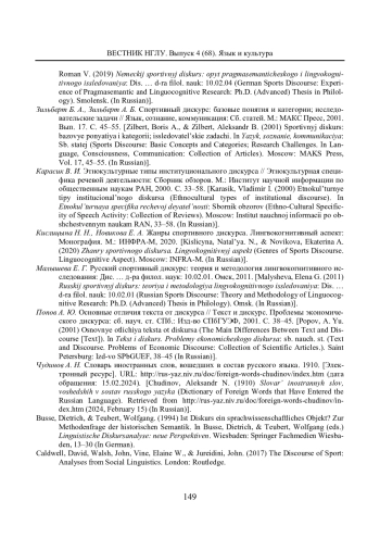 1. Белютин Р. В. Немецкий спортивный дискурс: опыт прагмасемантического и лингвокогнитивного исследования: Дис. … д-ра филол. наук: 10.02.04. Смоленск, 2019.