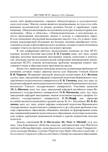 Настоящая статья посвящена инновационным практикам формирования и развития межкультурной компетентности специалистов разных стран мира, связанных с преподаванием русского языка или исследованиями русского языка и культуры, участников федерального проекта «Летний институт для преподавателей и исследователей», получивших возможность пройти обучение в России в аутентичной среде. Особое внимание уделяется авторской программе Нижегородского государственного лингвистического университет им. Н. А. Добролюбова, ставшего одной из площадок проекта в 2024 г. Проводится анализ программы с точки зрения структуры и содержания. Детально рассматриваются содержательные блоки с точки зрения их тематики, практической составляющей, социальной и культурной значимости. Подчеркивается, что формирование определенного уровня межкультурной компетентности как интегративной способности личности признавать и понимать другое мировоззрение и другую культуру, должно непременно подразумевать культурологическое наполнение. Сближению различных народов и культур способствует проектная деятельность в интернациональных группах. Поэтому обучение в аутентичной среде с возможностью познакомиться в рамках программы с различными городами России дает существенный импульс для формирования и развития межкультурной компетентности слушателей программы. Разнообразная тематика, высокий профессиональный уровень организаторов программы, ее модульная структура, инновационный, проектный подход к обучению позволяют в полном объеме достичь поставленной цели по формированию и развитию межкультурной компетентности слушателей.