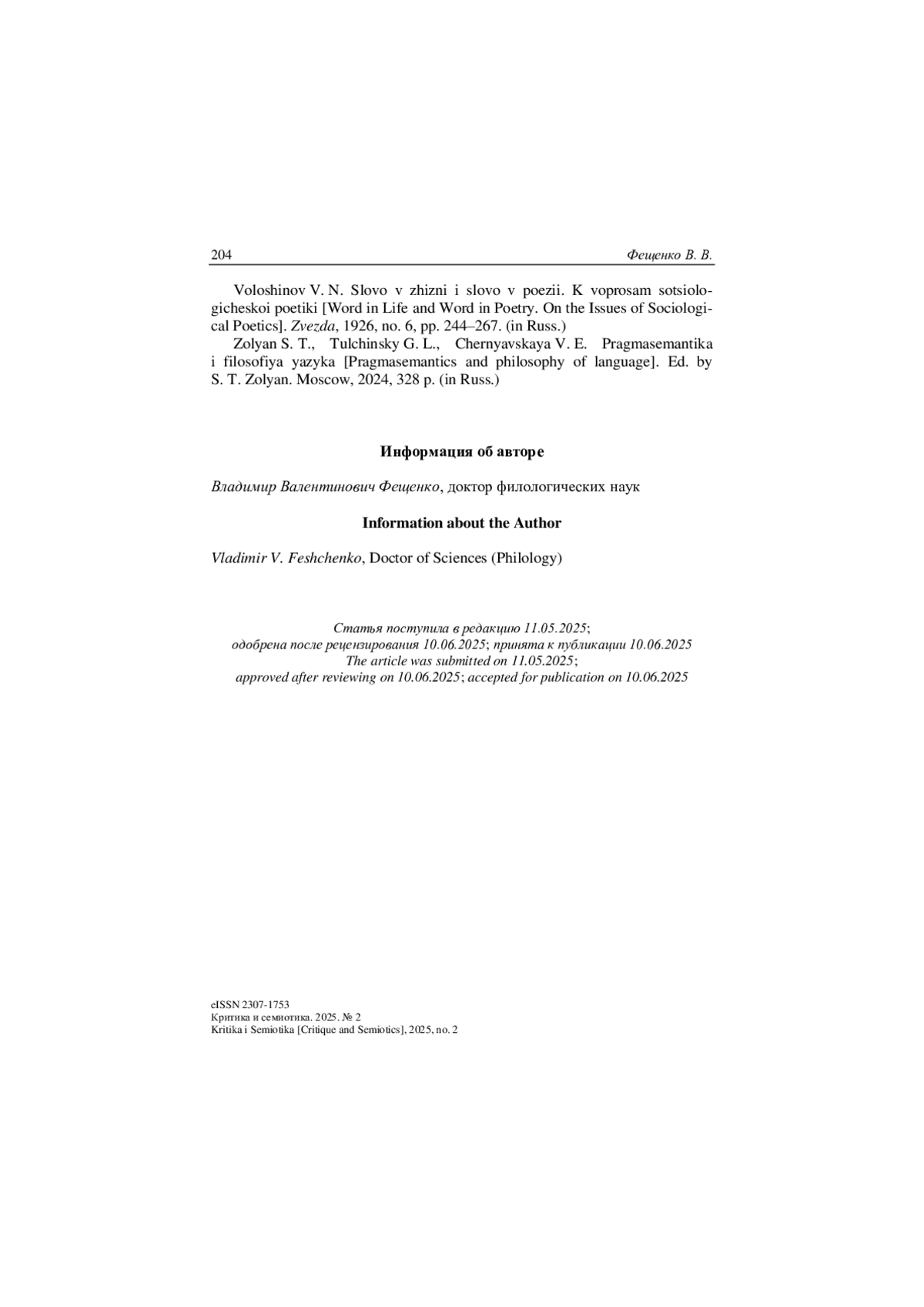 14. Соколова О. В., Фещенко В. В. Прагматические маркеры в современной поэзии: корпусно-дискурсивный анализ // Russian Journal of Linguistics. 2024. Т. 28, № 3. С. 706-733.
