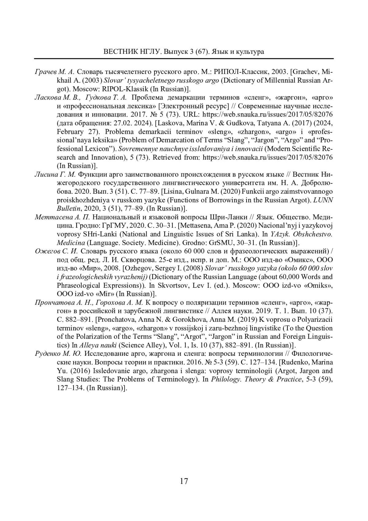 4. Ласкова М. В., Гудкова Т. А. Проблема демаркации терминов “сленг”, “жаргон”, “арго” и “профессиональная лексика” [Электронный ресурс] // Современные научные исследования и инновации. 2017. № 5 (73). URL: https://web.snauka.ru/issues/2017/05/82076 (дата обращения: 27.02. 2024). EDN: YRCLAF