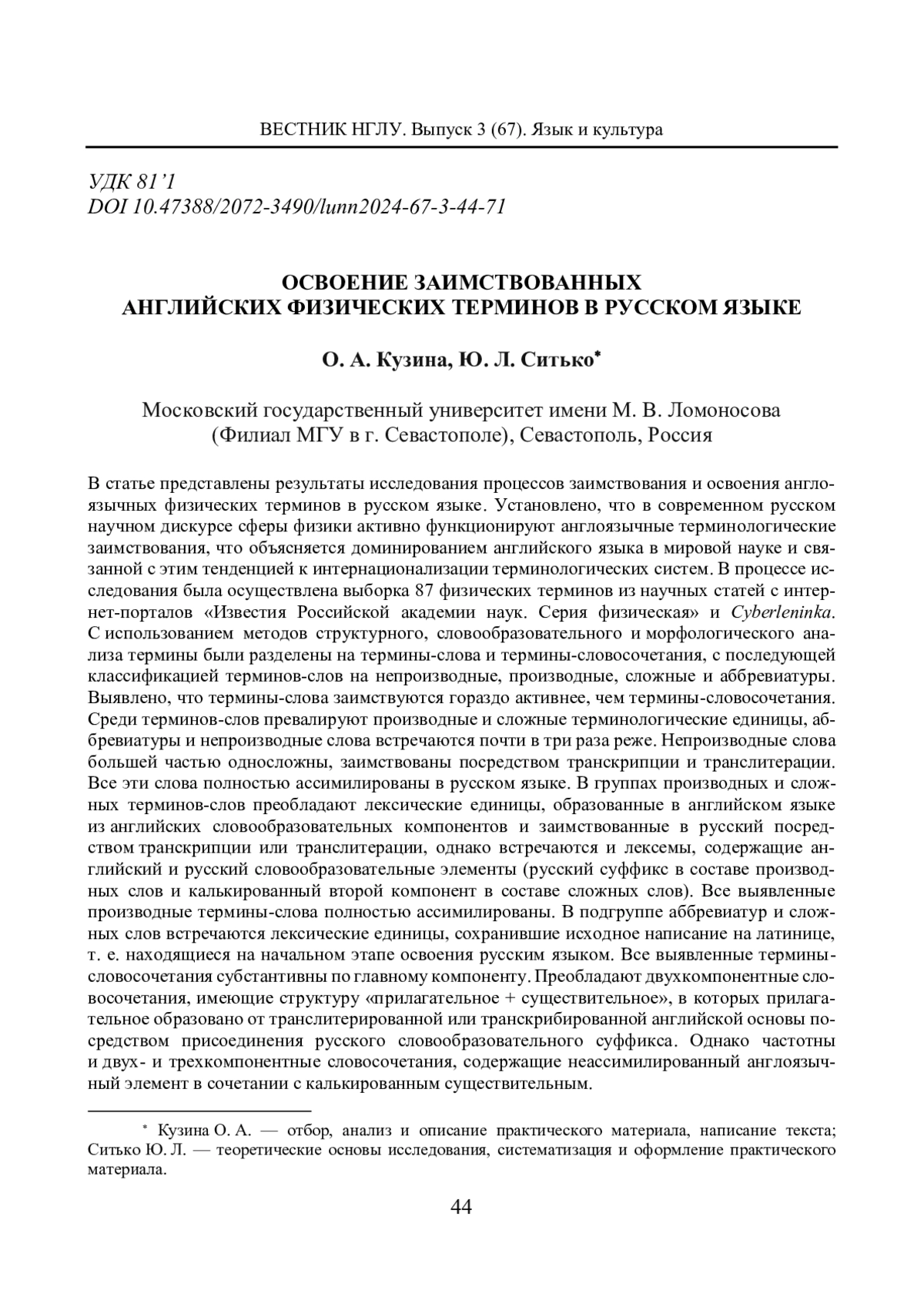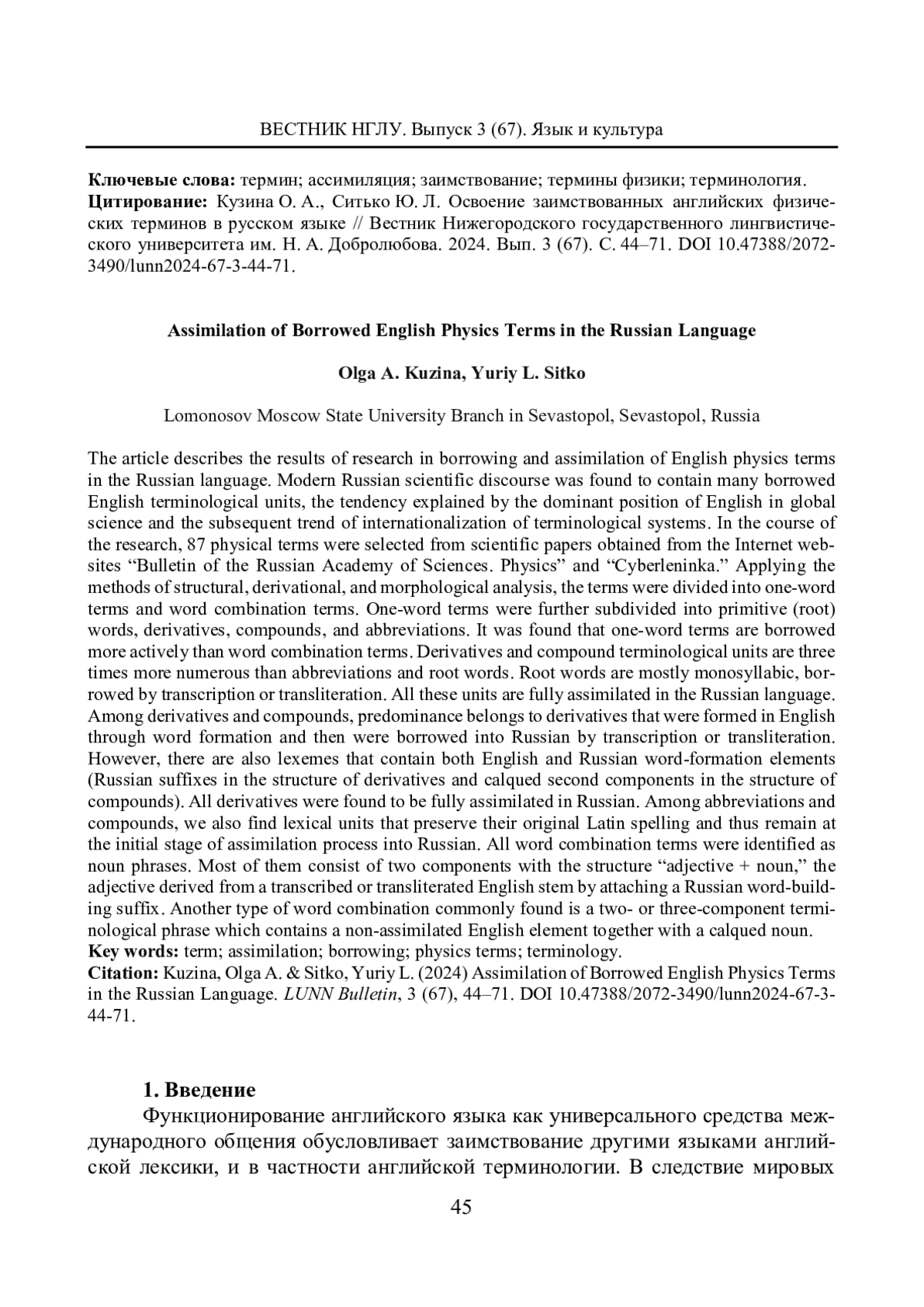 В статье представлены результаты исследования процессов заимствования и освоения англоязычных физических терминов в русском языке. Установлено, что в современном русском научном дискурсе сферы физики активно функционируют англоязычные терминологические заимствования, что объясняется доминированием английского языка в мировой науке и связанной с этим тенденцией к интернационализации терминологических систем. В процессе исследования была осуществлена выборка 87 физических терминов из научных статей с интернет-порталов «Известия Российской академии наук. Серия физическая» и Cyberleninka. С использованием методов структурного, словообразовательного и морфологического анализа термины были разделены на термины-слова и термины-словосочетания, с последующей классификацией терминов-слов на непроизводные, производные, сложные и аббревиатуры. Выявлено, что термины-слова заимствуются гораздо активнее, чем термины-словосочетания. Среди терминов-слов превалируют производные и сложные терминологические единицы, аббревиатуры и непроизводные слова встречаются почти в три раза реже. Непроизводные слова большей частью односложны, заимствованы посредством транскрипции и транслитерации. Все эти слова полностью ассимилированы в русском языке. В группах производных и сложных терминов-слов преобладают лексические единицы, образованные в английском языке из английских словообразовательных компонентов и заимствованные в русский посредством транскрипции или транслитерации, однако встречаются и лексемы, содержащие английский и русский словообразовательные элементы (русский суффикс в составе производных слов и калькированный второй компонент в составе сложных слов). Все выявленные производные термины-слова полностью ассимилированы. В подгруппе аббревиатур и сложных слов встречаются лексические единицы, сохранившие исходное написание на латинице, т. е. находящиеся на начальном этапе освоения русским языком. Все выявленные термины-словосочетания субстантивны по главному компоненту. Преобладают двухкомпонентные словосочетания, имеющие структуру «прилагательное + существительное», в которых прилагательное образовано от транслитерированной или транскрибированной английской основы посредством присоединения русского словообразовательного суффикса. Однако частотны и двух- и трехкомпонентные словосочетания, содержащие неассимилированный англоязычный элемент в сочетании с калькированным существительным.