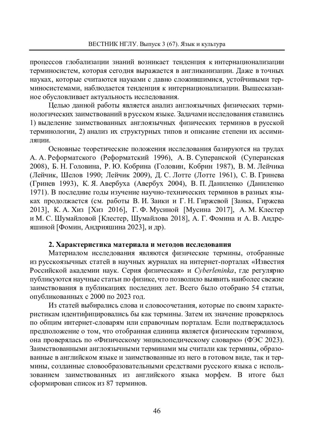 Материалом исследования являются физические термины, отобранные из русскоязычных статей в научных журналах на интернет-порталах «Известия Российской академии наук. Серия физическая» и Cyberleninka, где регулярно публикуются научные статьи по физике, что позволило выявить наиболее свежие заимствования в публикациях последних лет. Всего было отобрано 54 статьи, опубликованных с 2000 по 2023 год.
