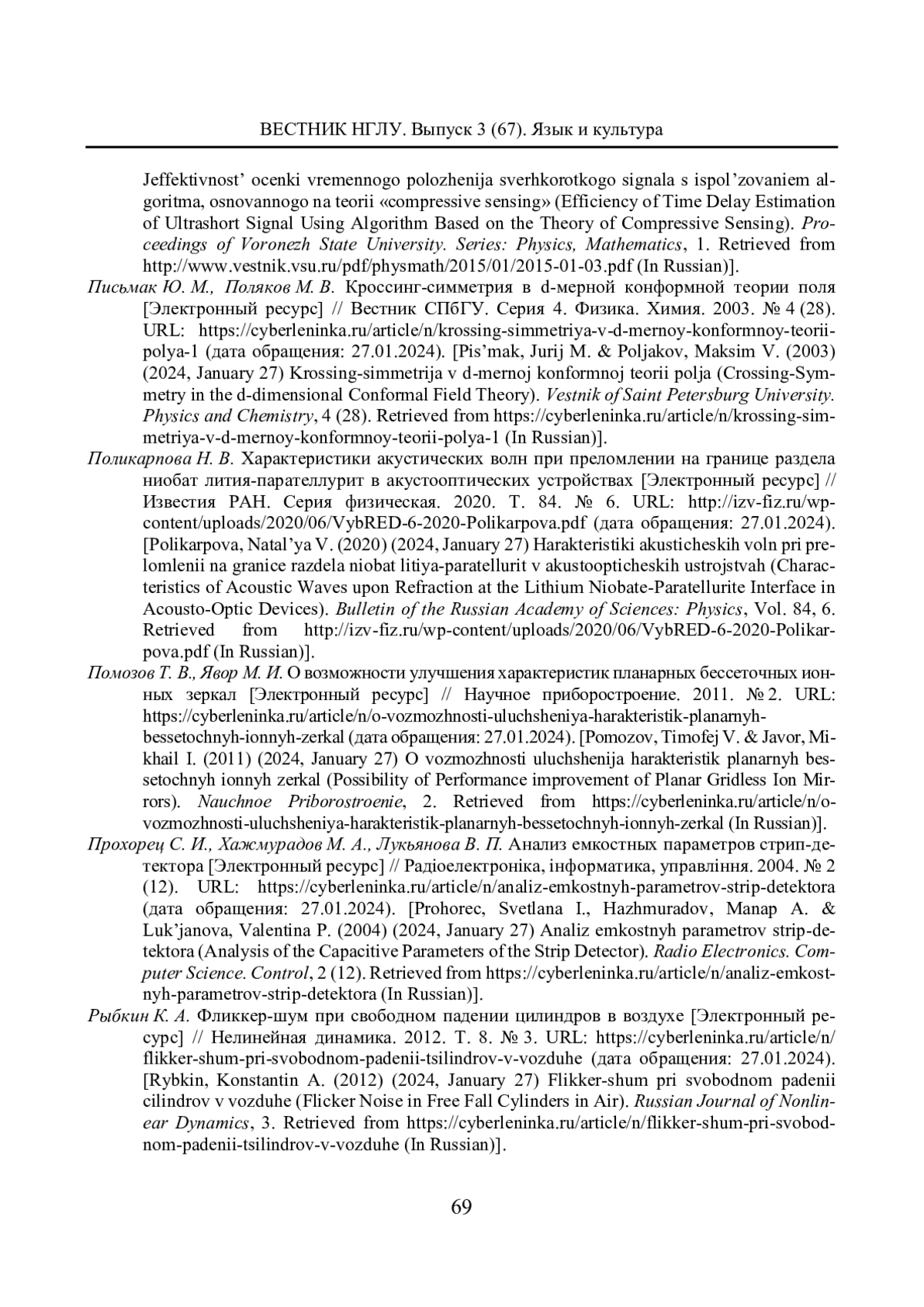 73. Рыбкин К. А. Фликкер-шум при свободном падении цилиндров в воздухе [Электронный ресурс] // Нелинейная динамика. 2012. Т. 8. № 3. URL: https://cyberleninka.ru/article/n/ flikker-shum-pri-svobodnom-padenii-tsilindrov-v-vozduhe (дата обращения: 27.01.2024). EDN: PIJPHF