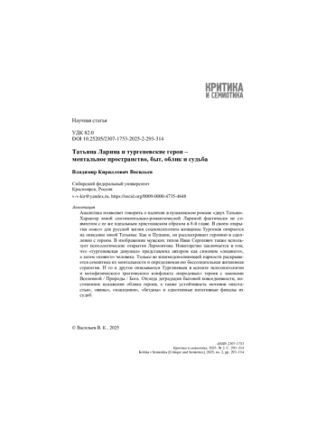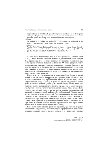 Аналитика позволяет говорить о наличии в пушкинском романе «двух Татьян». Характер юной сентиментально-романтической Лариной фактически не совместим с ее же идеальным христианским образом в 8-й главе. В своем открытии нового для русской жизни социопсихотипа женщины Тургенев опирается на описание юной Татьяны. Как и Пушкин, он рассматривает героиню в сцеплении с героем. В изображении мужских типов Иван Сергеевич также использует психологические открытия Лермонтова. Новаторство заключается в том, что «тургеневская девушка» представлена автором как синоним «лишнего», а затем «нового» человека. Только во взаимодополняющей парности раскрывается семантика их ментальности и определяемая ею бессознательная жизненная стратегия. И то и другое описывается Тургеневым в аспекте психопатологии и метафизического трагического конфликта «передовых» героев с законами Вселенной / Природы / Бога. Отсюда деградация бытовой повседневности, постепенное искажение облика героев, а также устойчивость мотивов «несчастья», «вины», «наказания», «бездны» и однотипные негативные финалы их судеб.